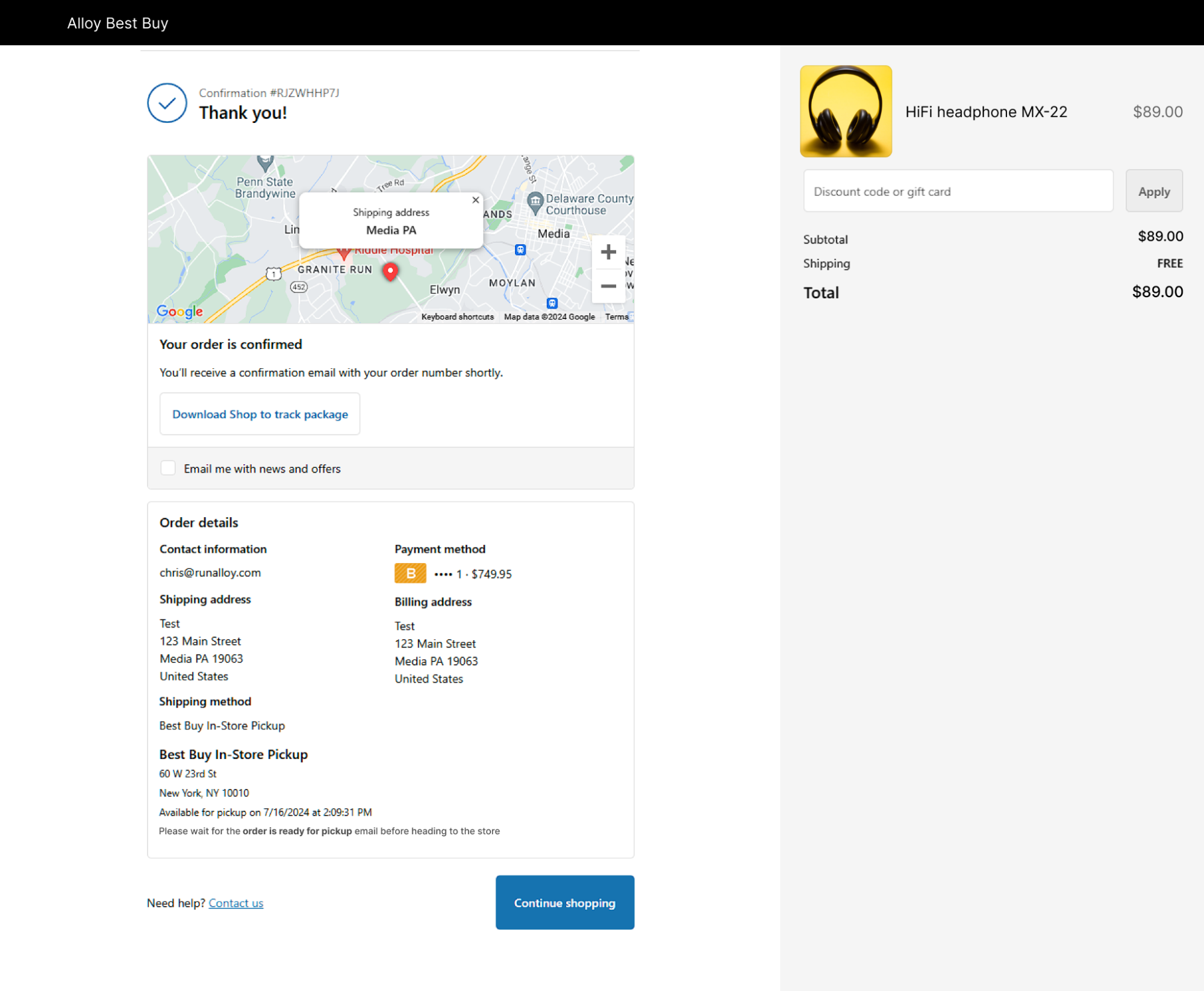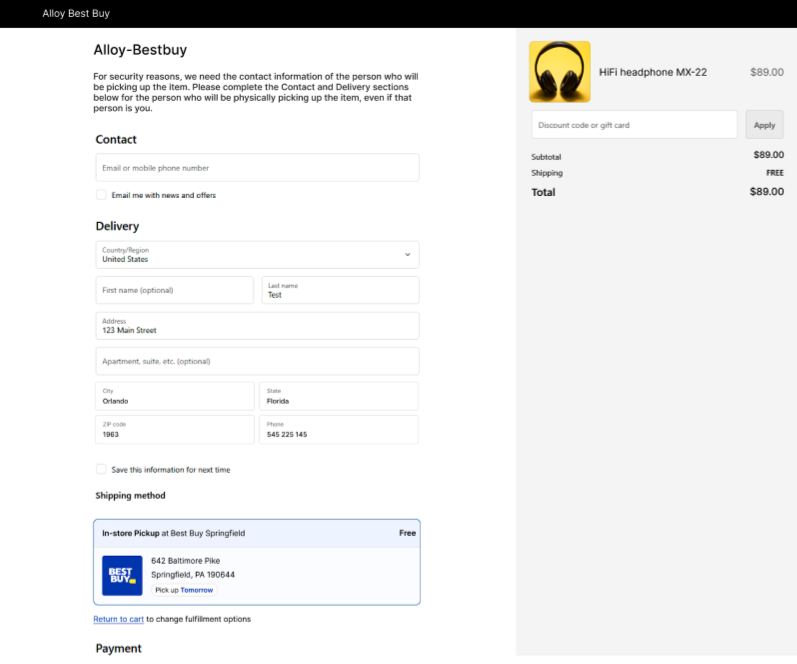 If the shopper selects Best In-Store Pickup, the checkout experience will vary slightly from the standard checkout. There will be a copy explaining the required information the shopper must provide for a successful pickup at Best Buy. The shipping method will show In-Store Pickup with the location detail and timeframe. And finally, there will be a link to return to the cart page if the shopper wishes to change the fulfillment option back to Shipping.
