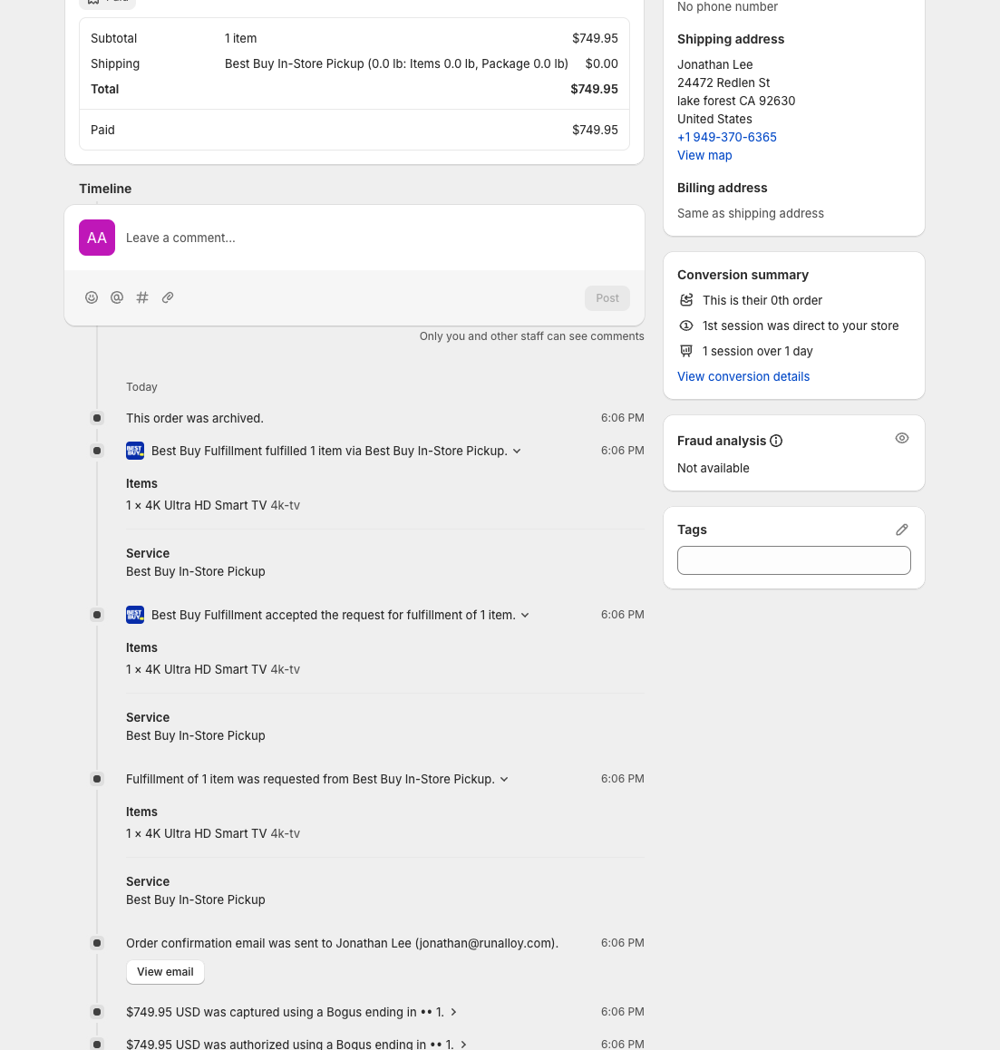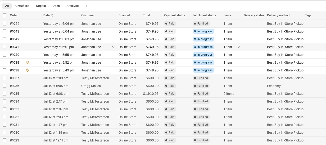 As a Shopify merchant, you can still see your Best Buy Pickup Order in Order History in Shopify. As Best Buy will handle the fulfillment, the Best Buy Fulfillment app will continuously update your order status automatically.