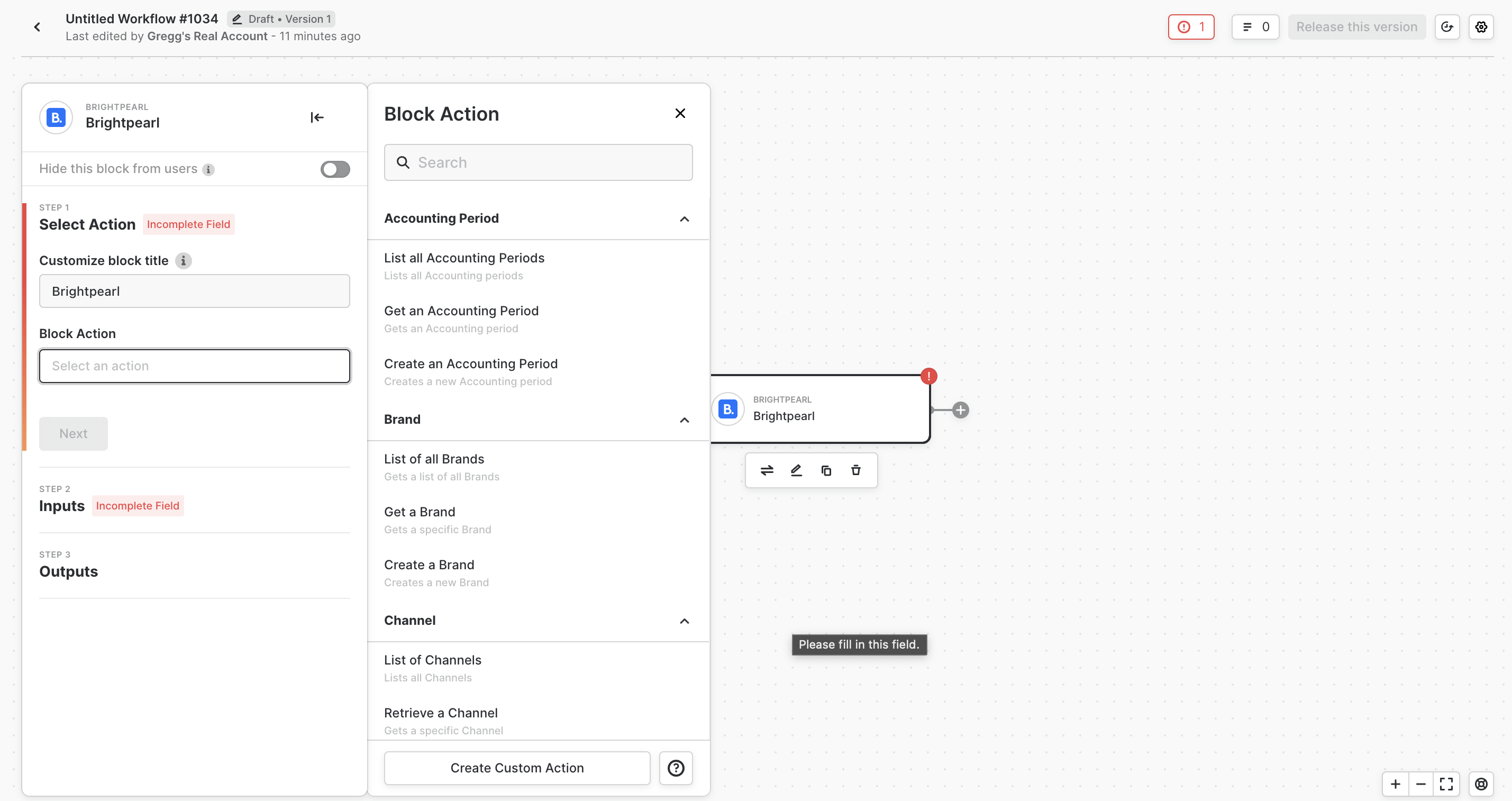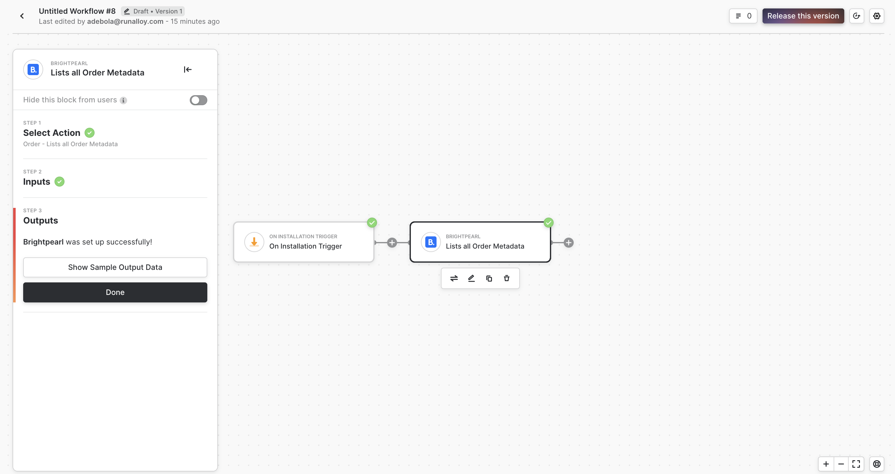 Continue building your workflow as you please. When done, click Release this version in the top right to launch your new Brightpearl integration.