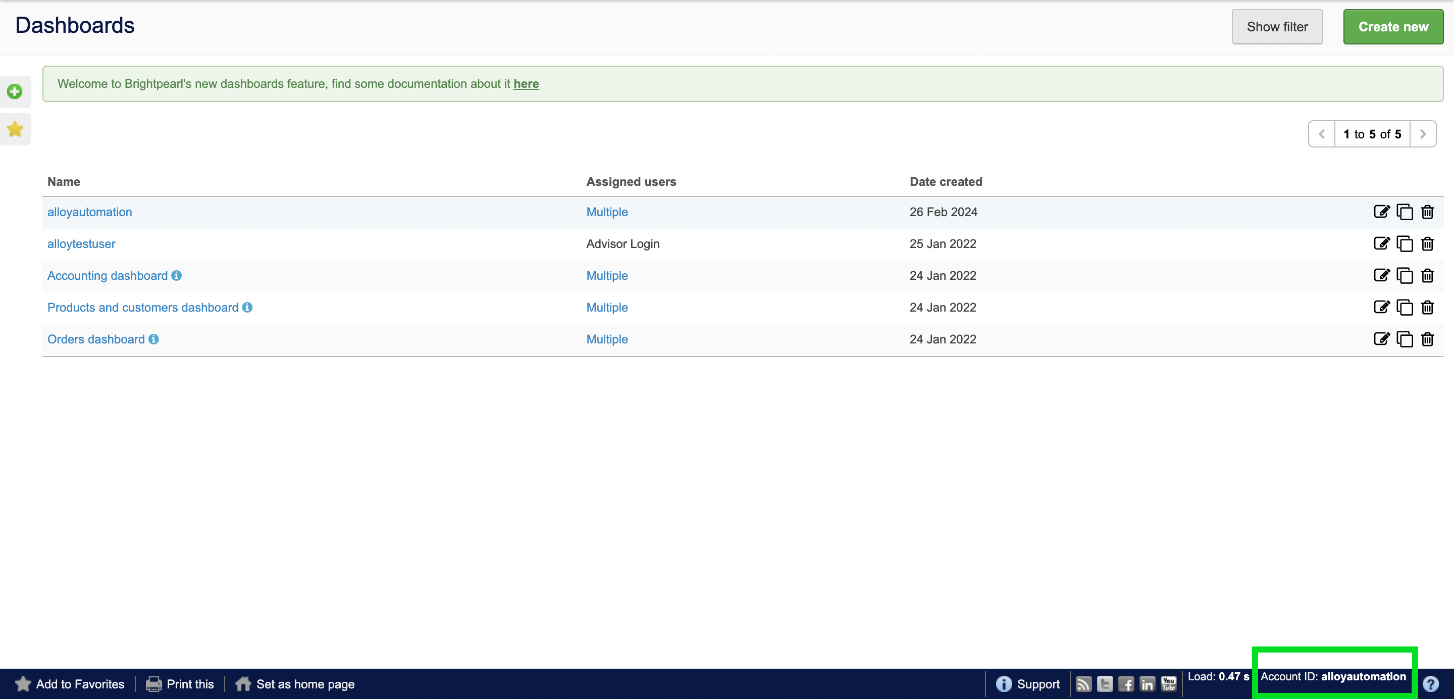 To connect to a customer’s Brightpearl account, customers would need to grant permissions to your app. To do so, Customers would require their Brightpearl account ID, and, a username and password. The Brightpearl account ID can be found in the bottom right of the Brightpearl dashboard.