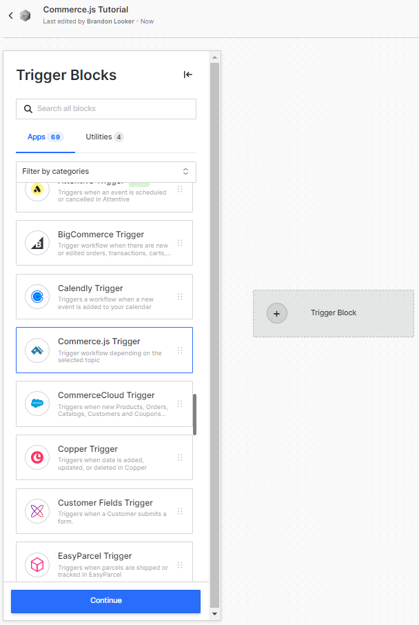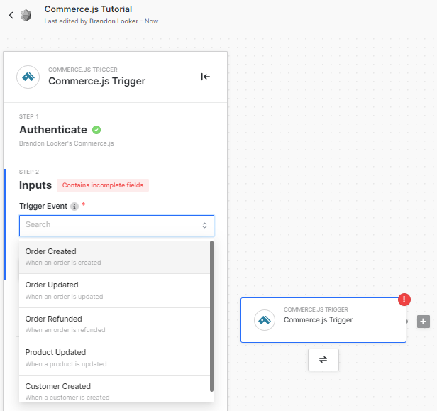 Choose an event to trigger the workflow. For example, if you choose Order Created, the workflow will run every time an order is created in your Commerce.js store.