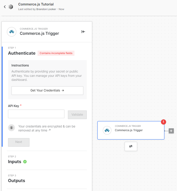 Enter your API Key. To find your API Key, simply click on the “Get Your Credentials” button within the Commerce.js trigger.