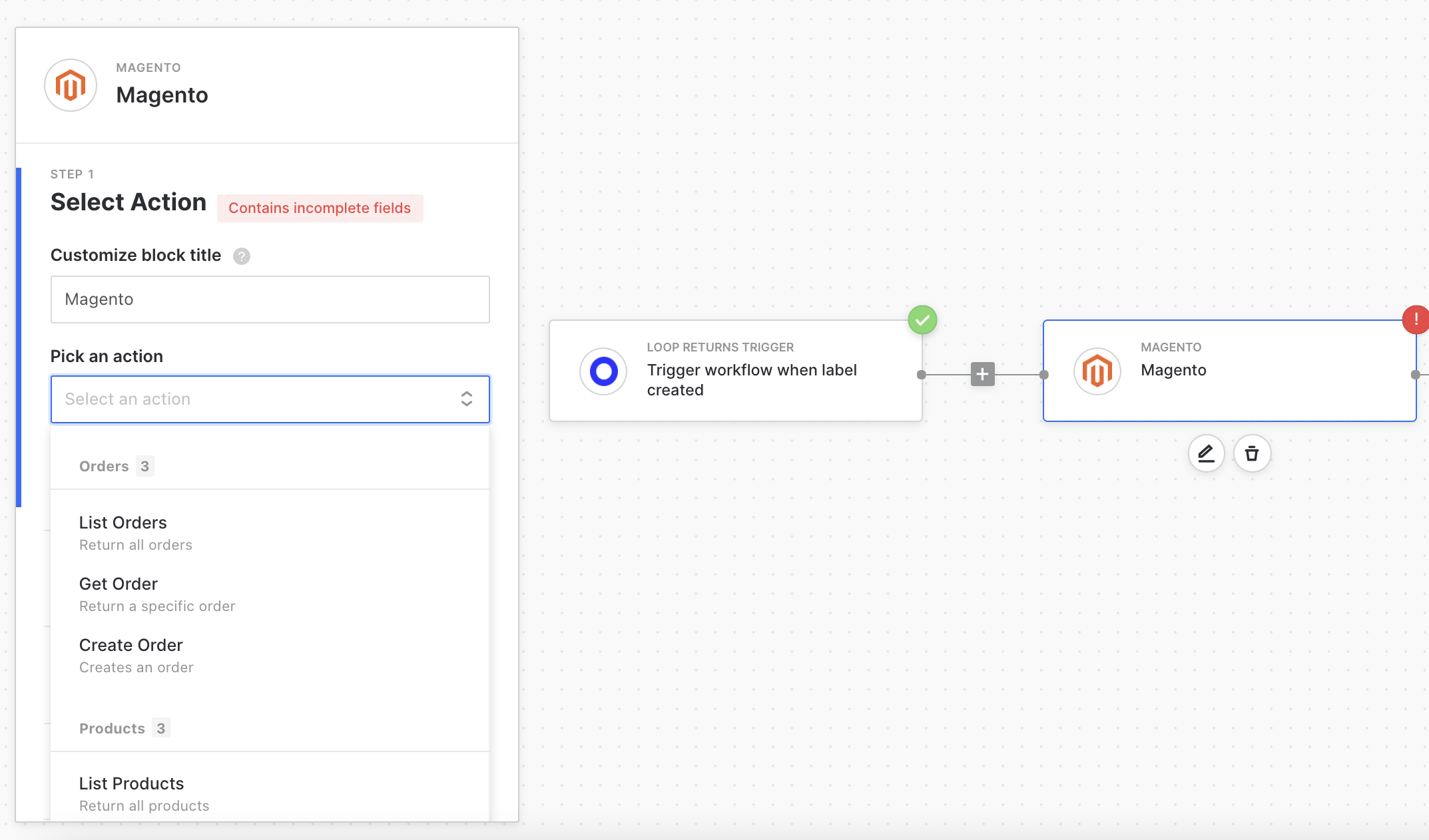 Choose Magento as the second block in your workflow by clicking on the + icon next to the trigger
