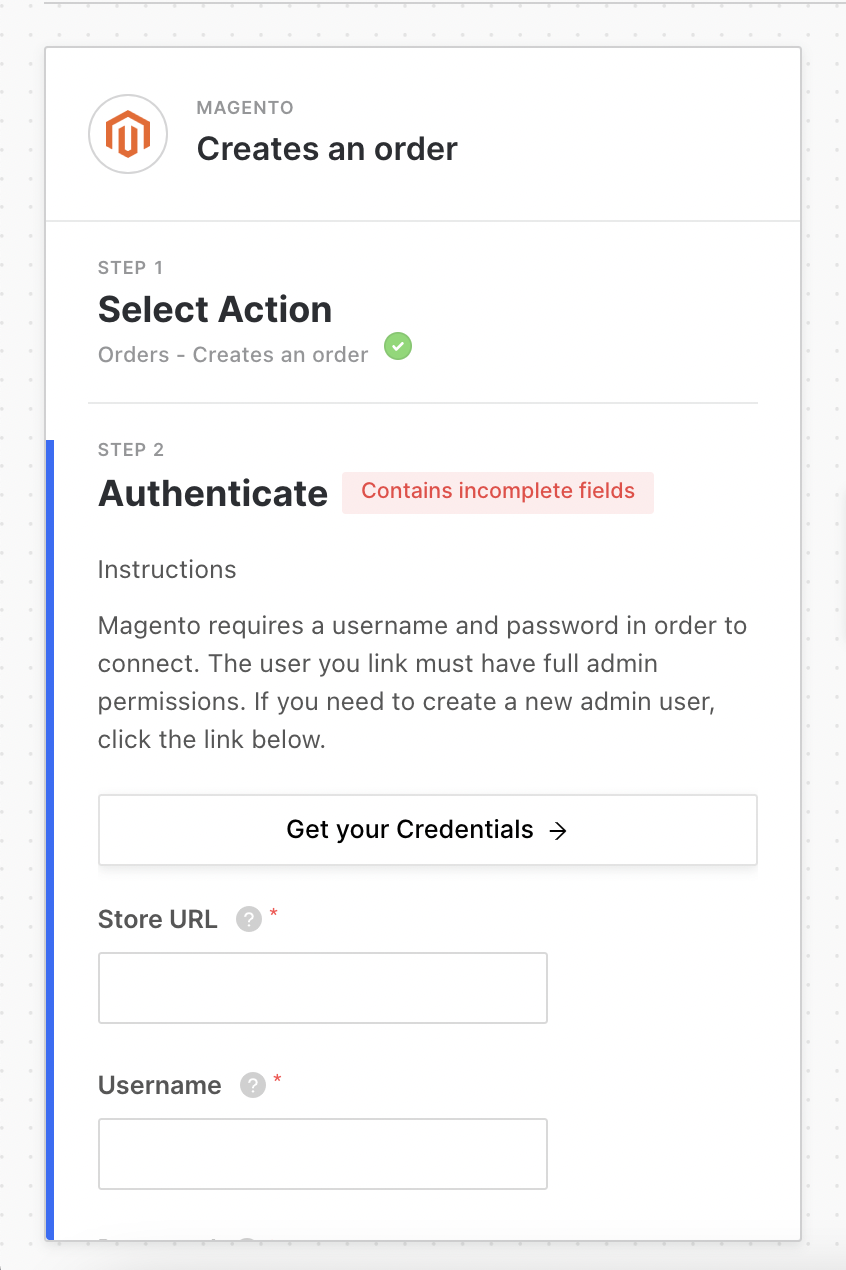 In the next step, you’ll need to authenticate your Magento store. More details can be found in Magento’s documentation. You’ll need to fill out the fields in your Magento block: