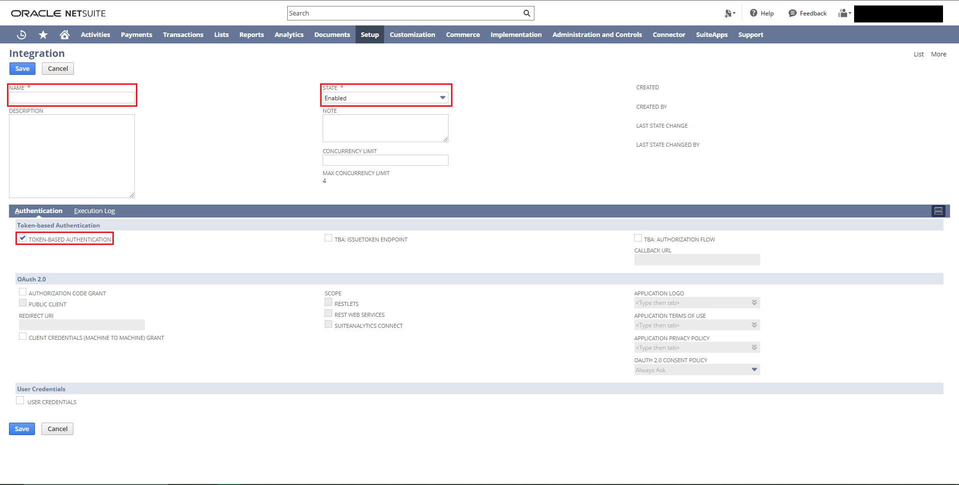 From here, you’ll need to create the integration. Give the integration a name, set the state as enabled and select “Token-Based Authentication” as the Authentication Sublist.