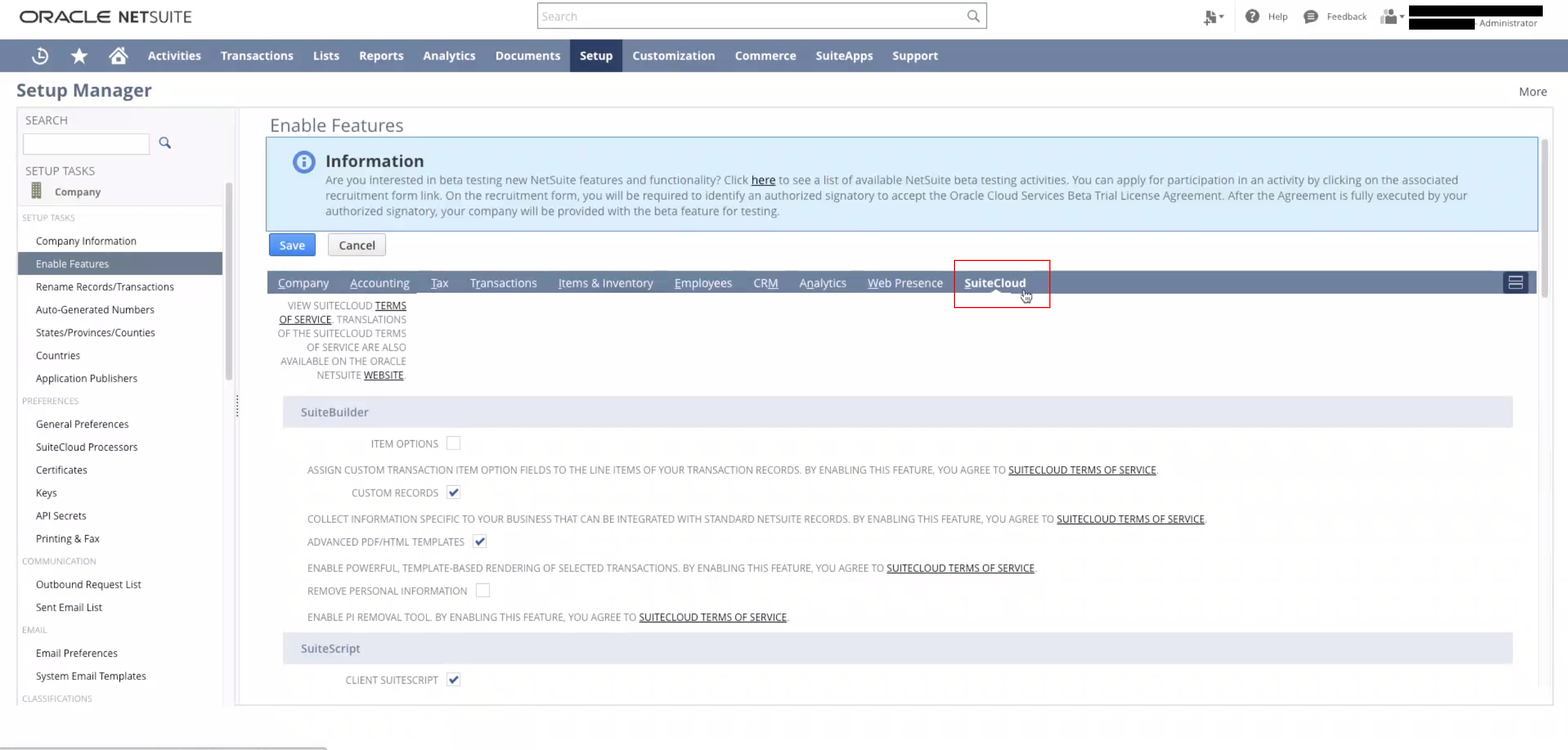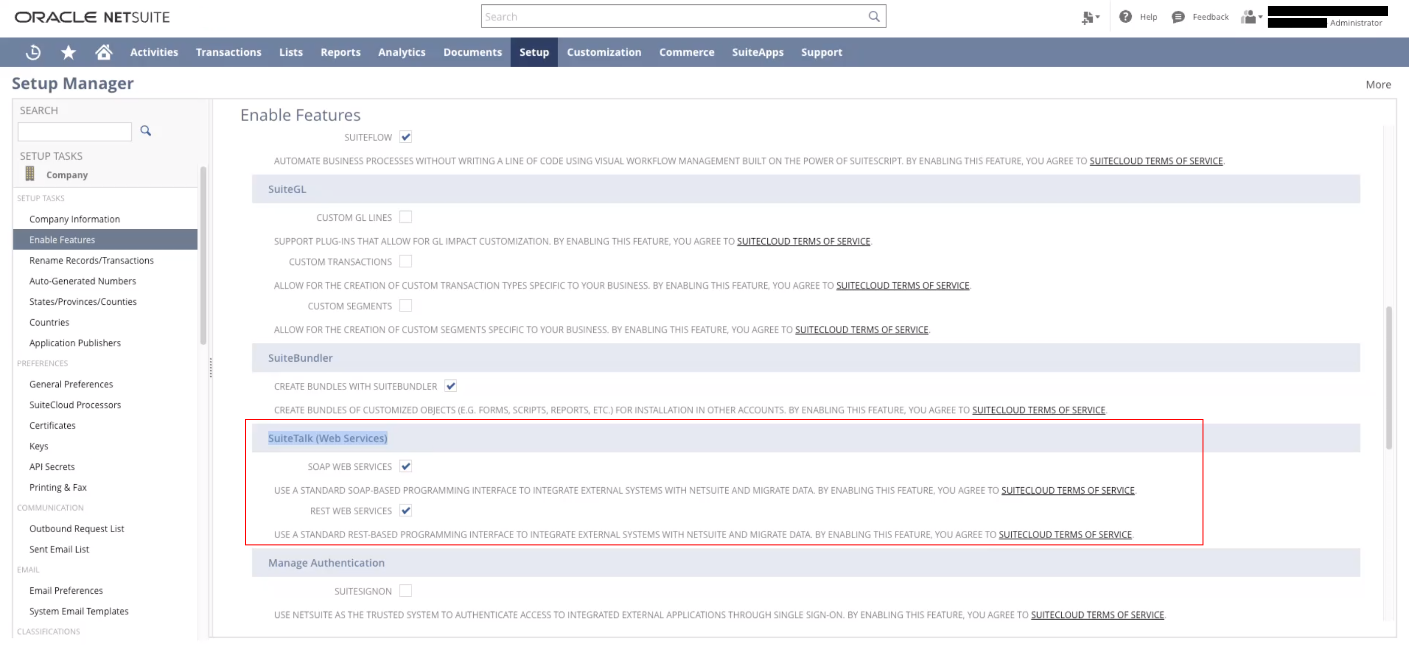 Next, you’ll need to enable Token-based Authentication in your NetSuite account. To do so, navigate to Setup > Company > Enable Features > **SuiteCloud **> then scroll down until you see SuiteTalk Web Services.