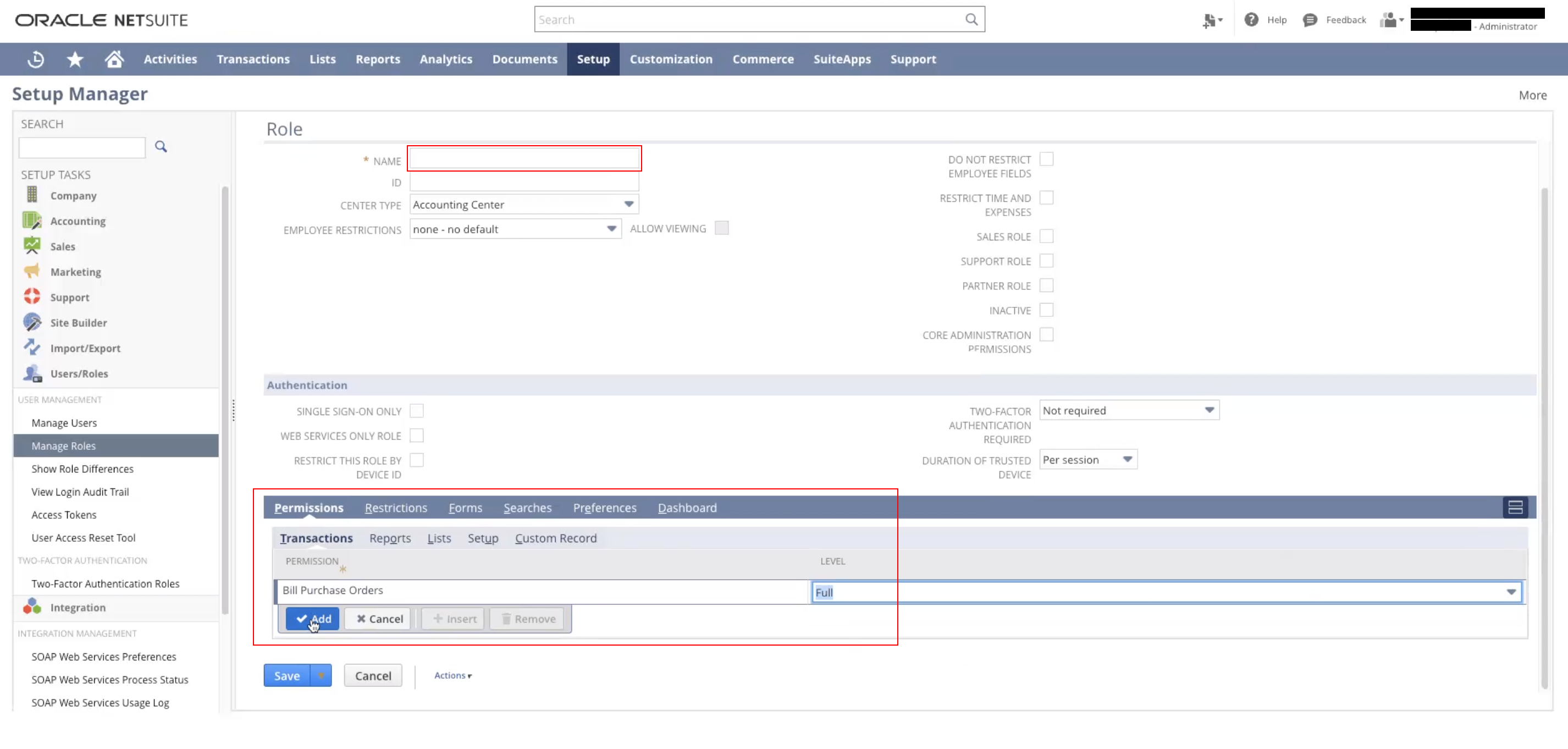 Then, navigate to Permissions Sublist > Transactions and add Full for all permissions.
