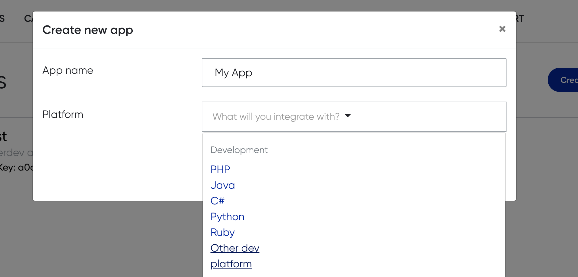 Click Create new app > name the app and select “other dev platform” under the “platform” section