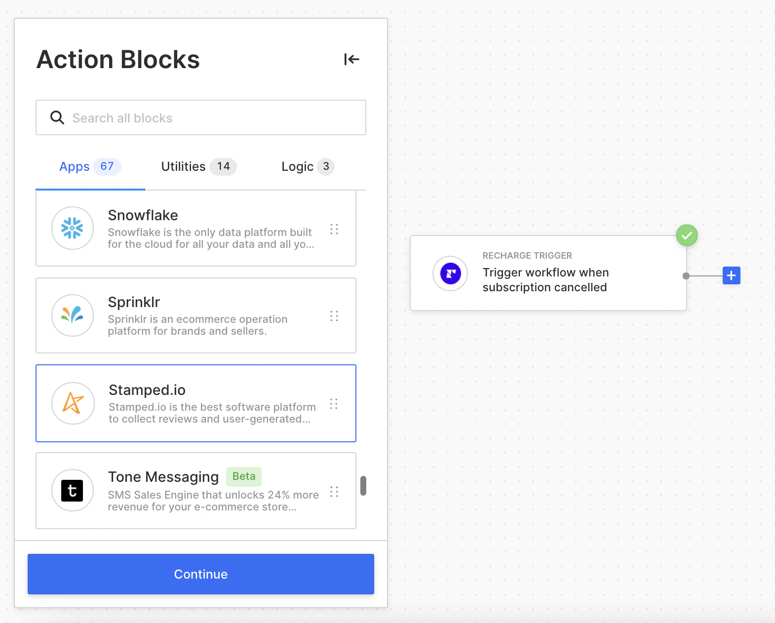 Select ReCharge Trigger, or any app you’d like to trigger the workflow. Set up the app.