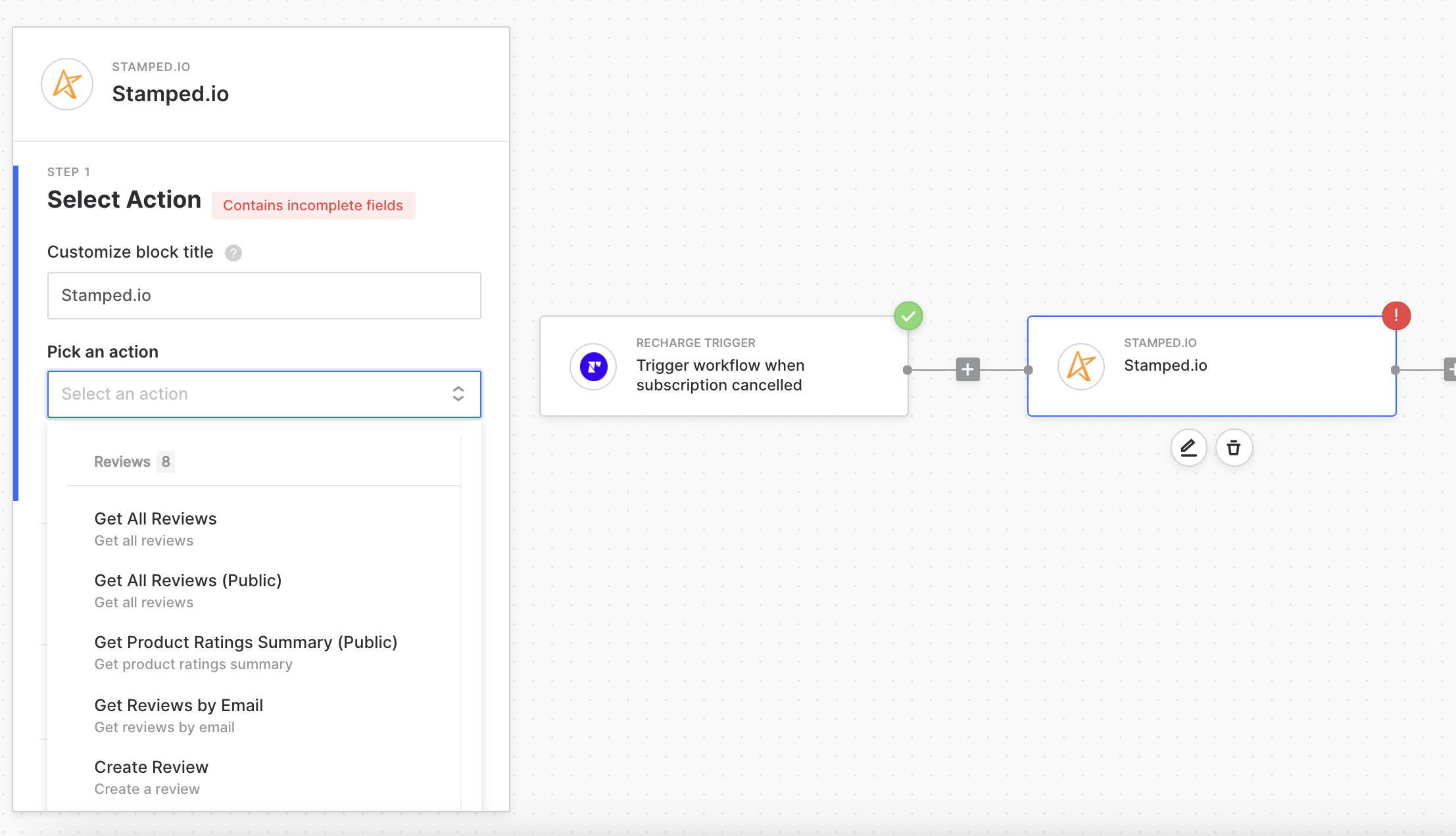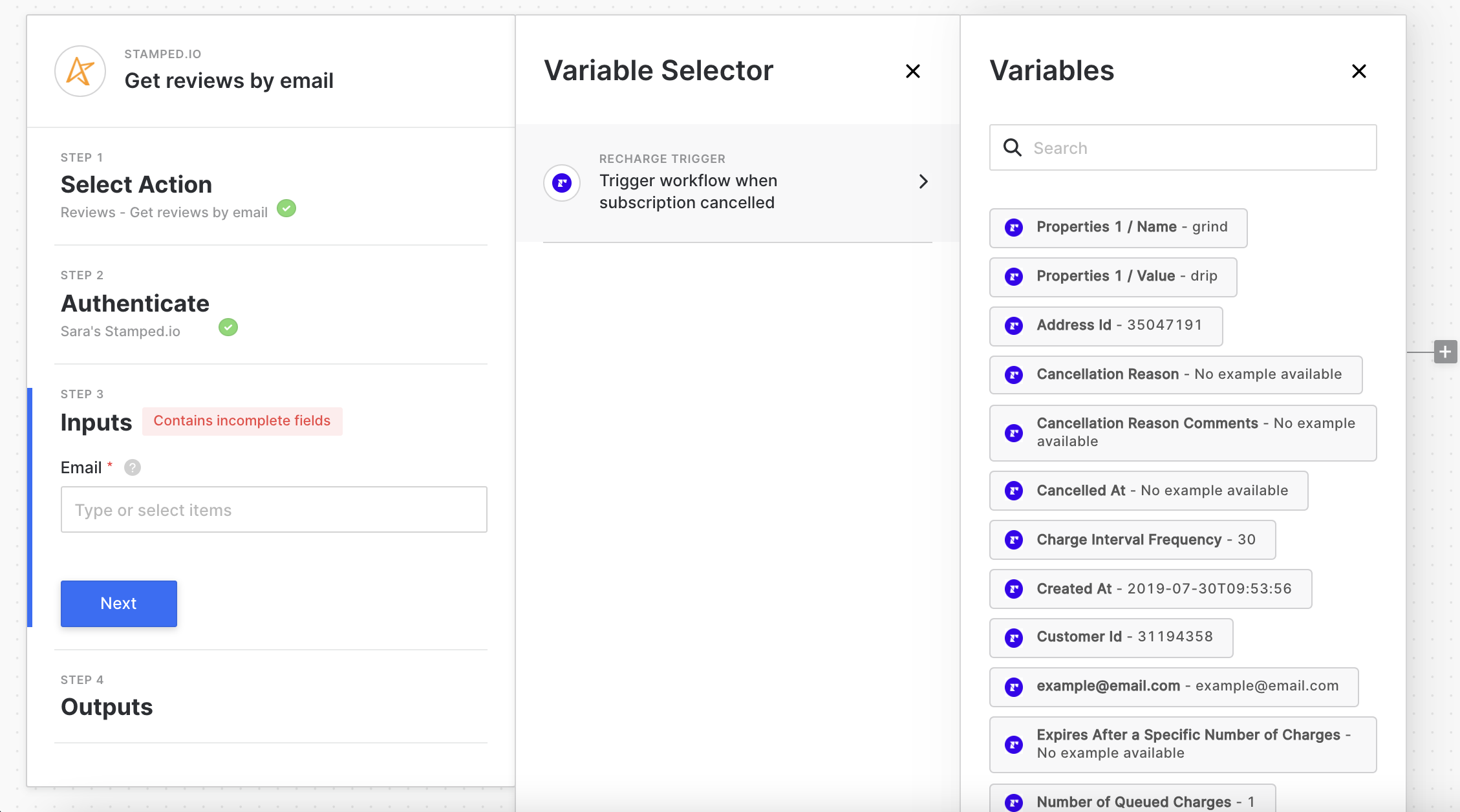 Configure your Stamped.io block by adding in the output of your workflow’s trigger or any other preceding blocks