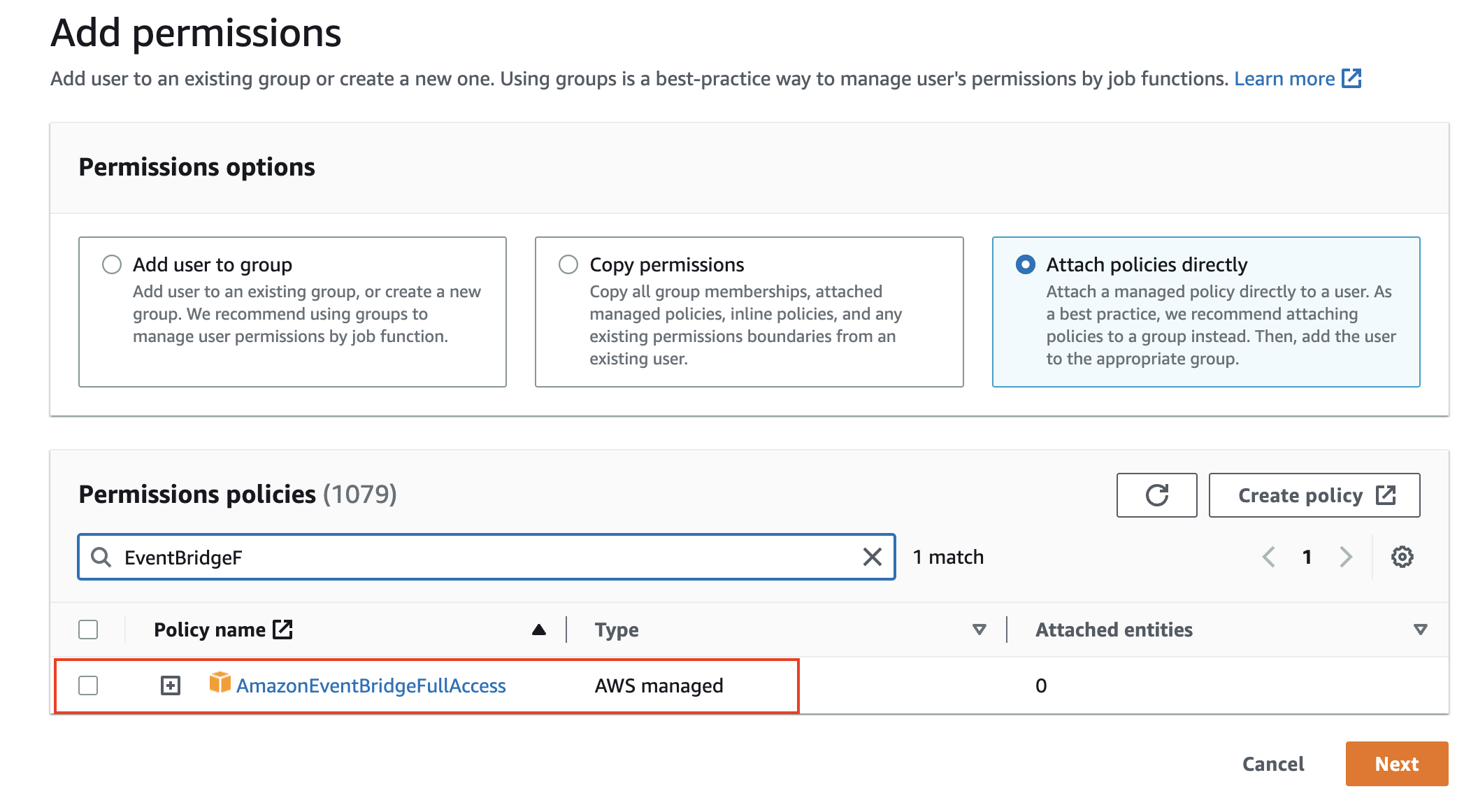 Once on the user, go to the Permissions tab and choose “Add permissions” and search for AWS EventBridge. Be sure to select “Attach policies directly” in the Permission options section.