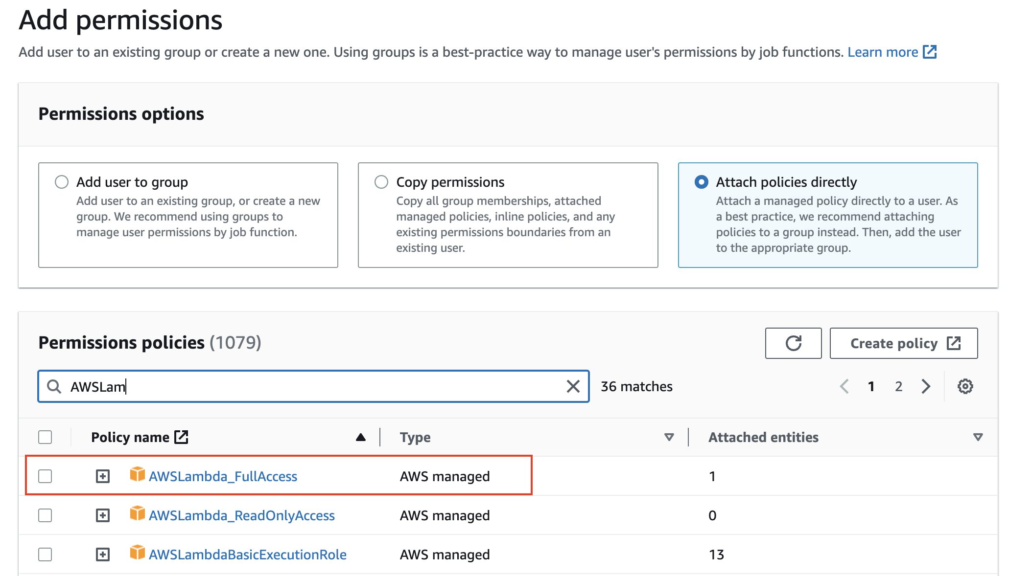 Once on the user, go to the Permissions tab and choose “Add permissions” and search for AWS Lambda. Be sure to select “Attach policies directly” in the Permission options section.