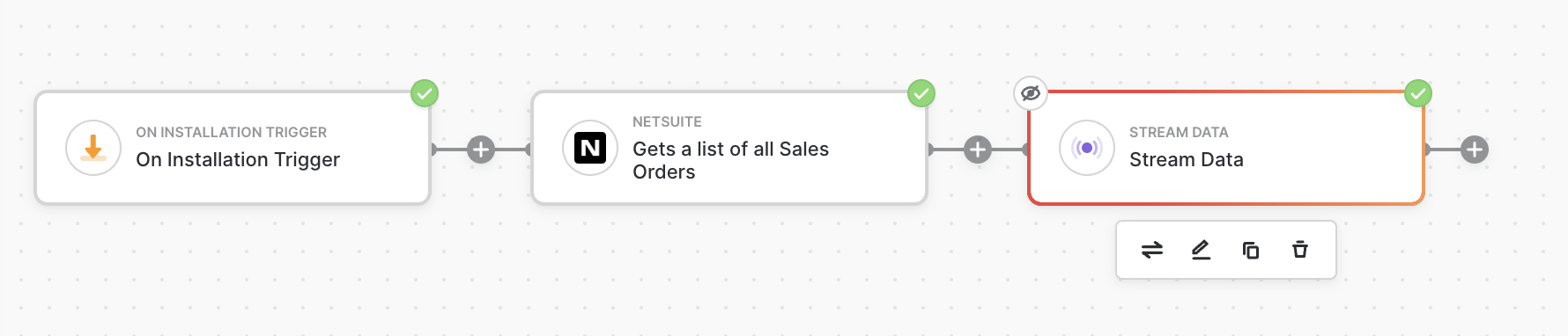 In the next example, we have a workflow that runs once upon installation, then gets a list of sales orders from NetSuite, and subsequently streams them to your sever via Data Stream. Let’s say you have 1,000 orders in NetSuite.