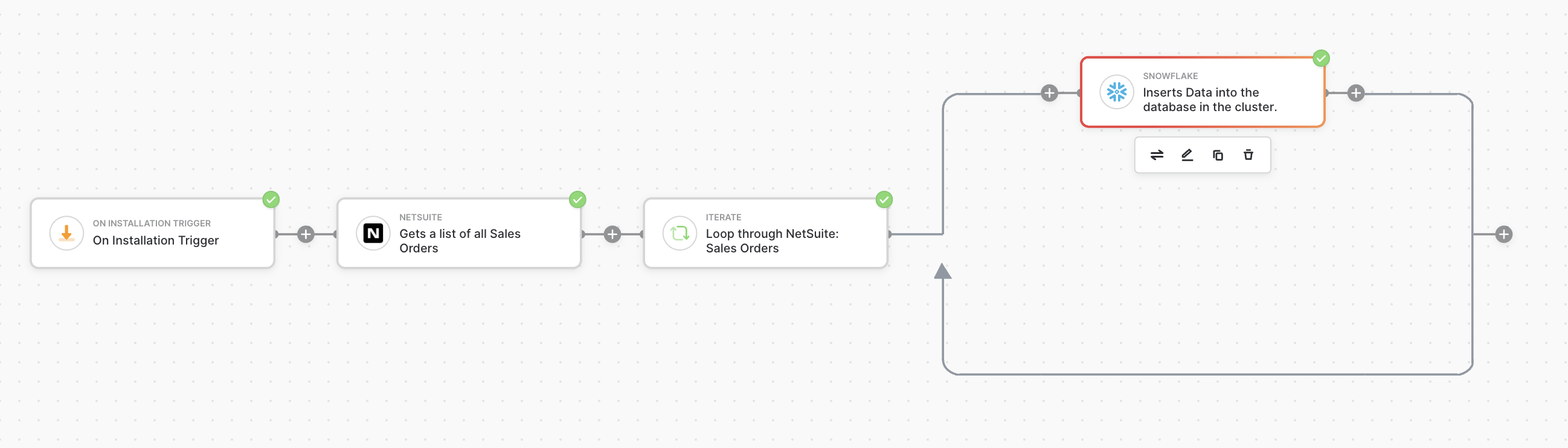 Now let’s consider a slightly more advanced workflow. The workflow below runs once upon installation, then gets a list of sales orders from NetSuite, iterates through each item in the list, and subsequently inserts each record into Snowflake. Once again, let’s assume you have 1,000 orders in NetSuite.