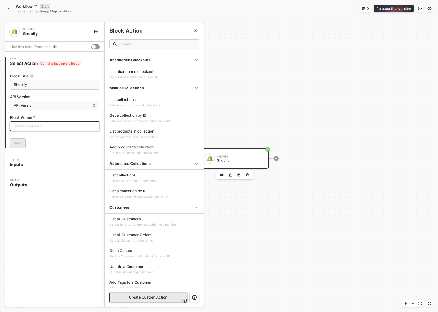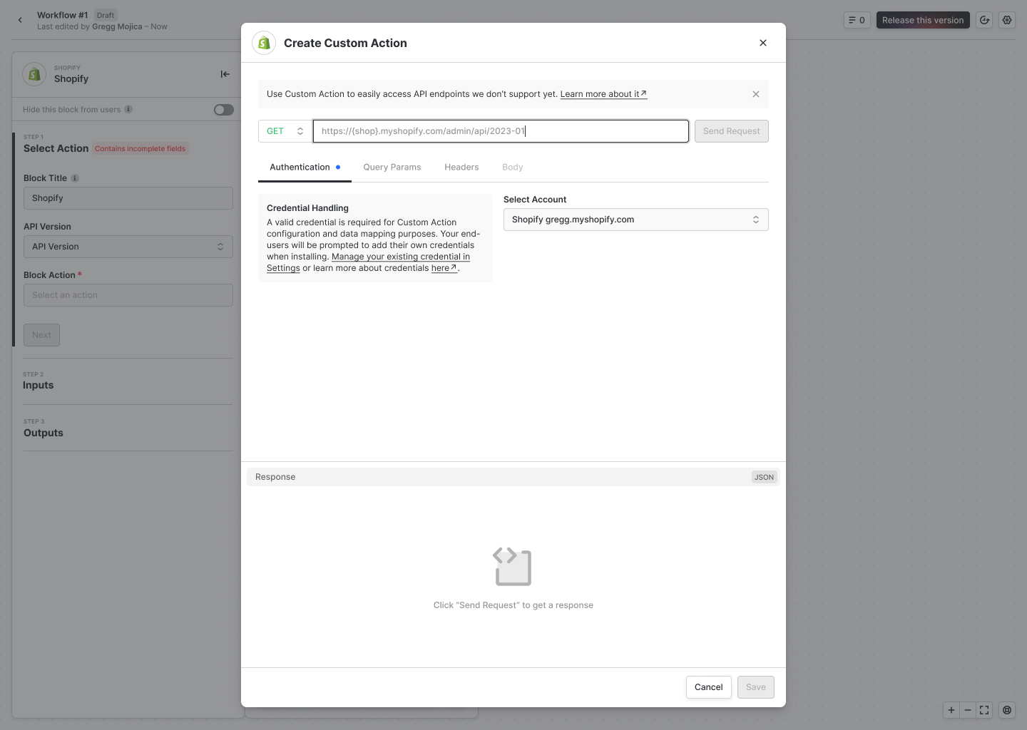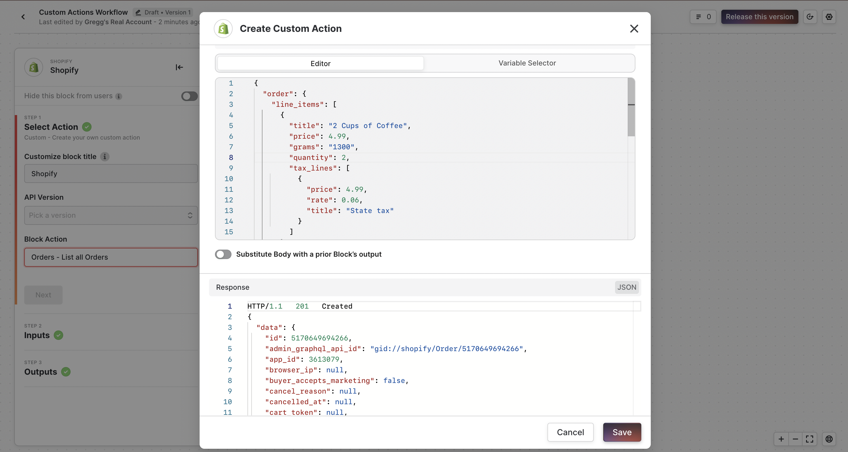 POST /orders endpoint that isn’t yet mapped in the Shopify connector. You can use Custom Action to call this endpoint directly and return the JSON response into your workflow.