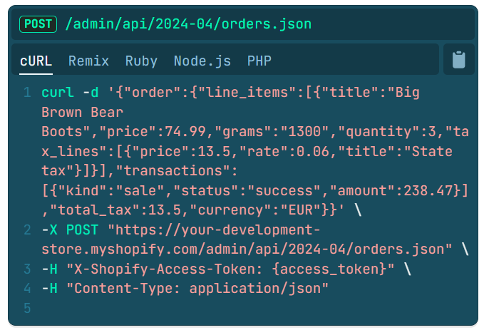 GET, POST, PUT, etc.) and the Request Path relative to the app’s API root.Example: for POST https://api.shopify.com/admin/api/2023-10/orders.json,enter only