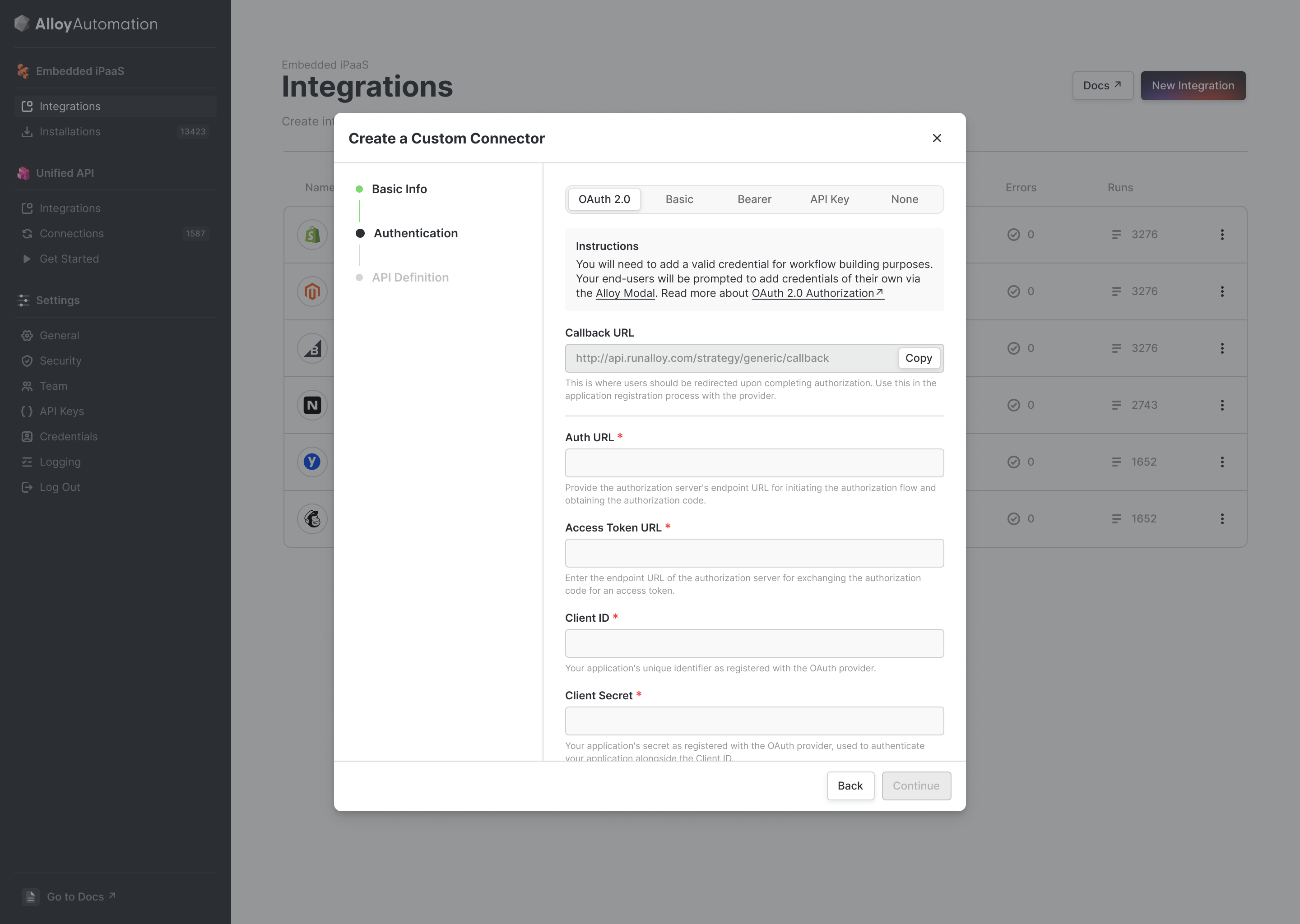 When configuring OAuth 2.0 for third-party apps, you’ll need to provide information to help Alloy authorize your end-users. The required fields are detailed below:- Callback URL: This is where users should be redirected after authorization has been completed. Use this in the application registration process for the third-party app.