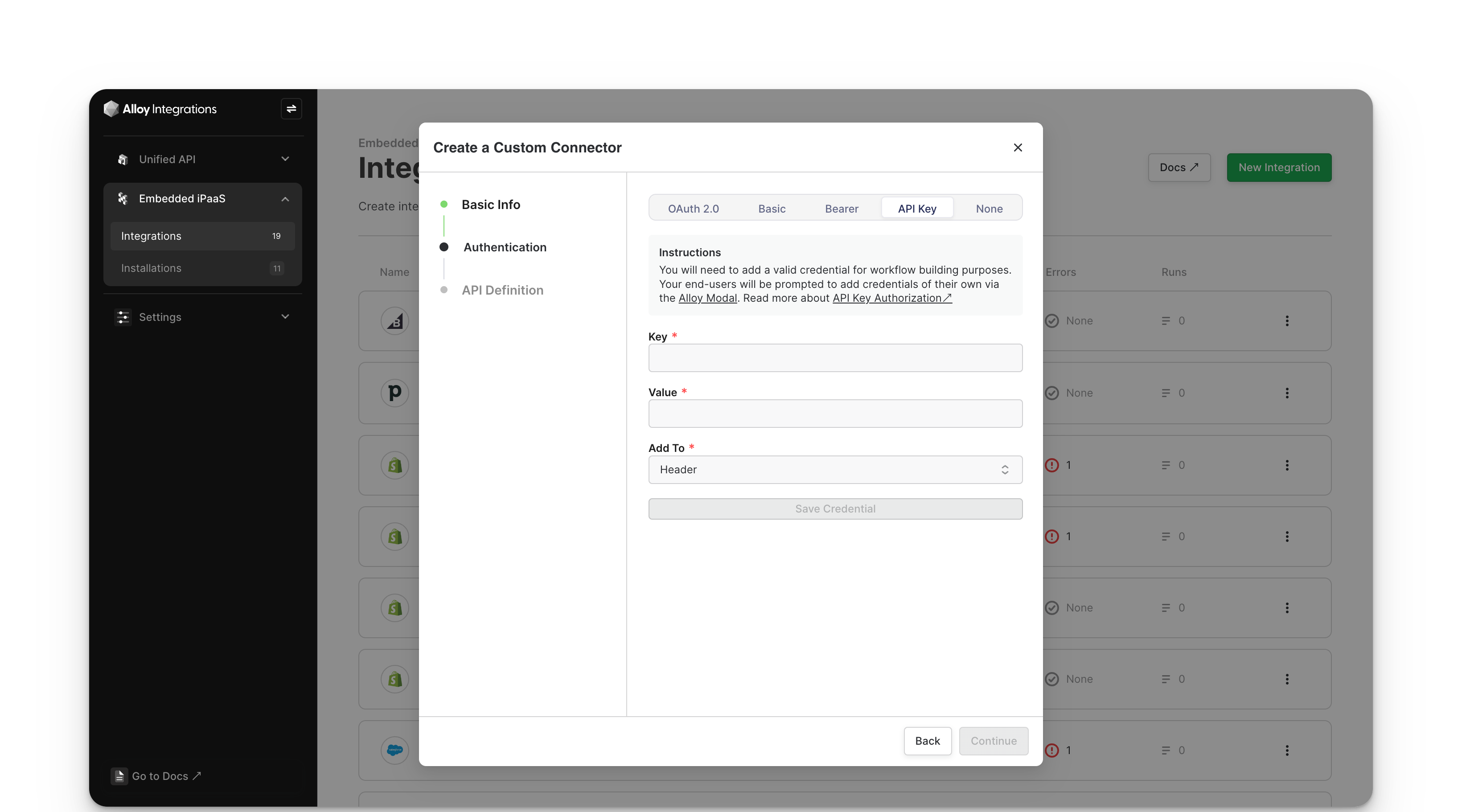 Navigate to the Authentication step. Switch to the API Key screen by clicking on the API Key tab in the modal.