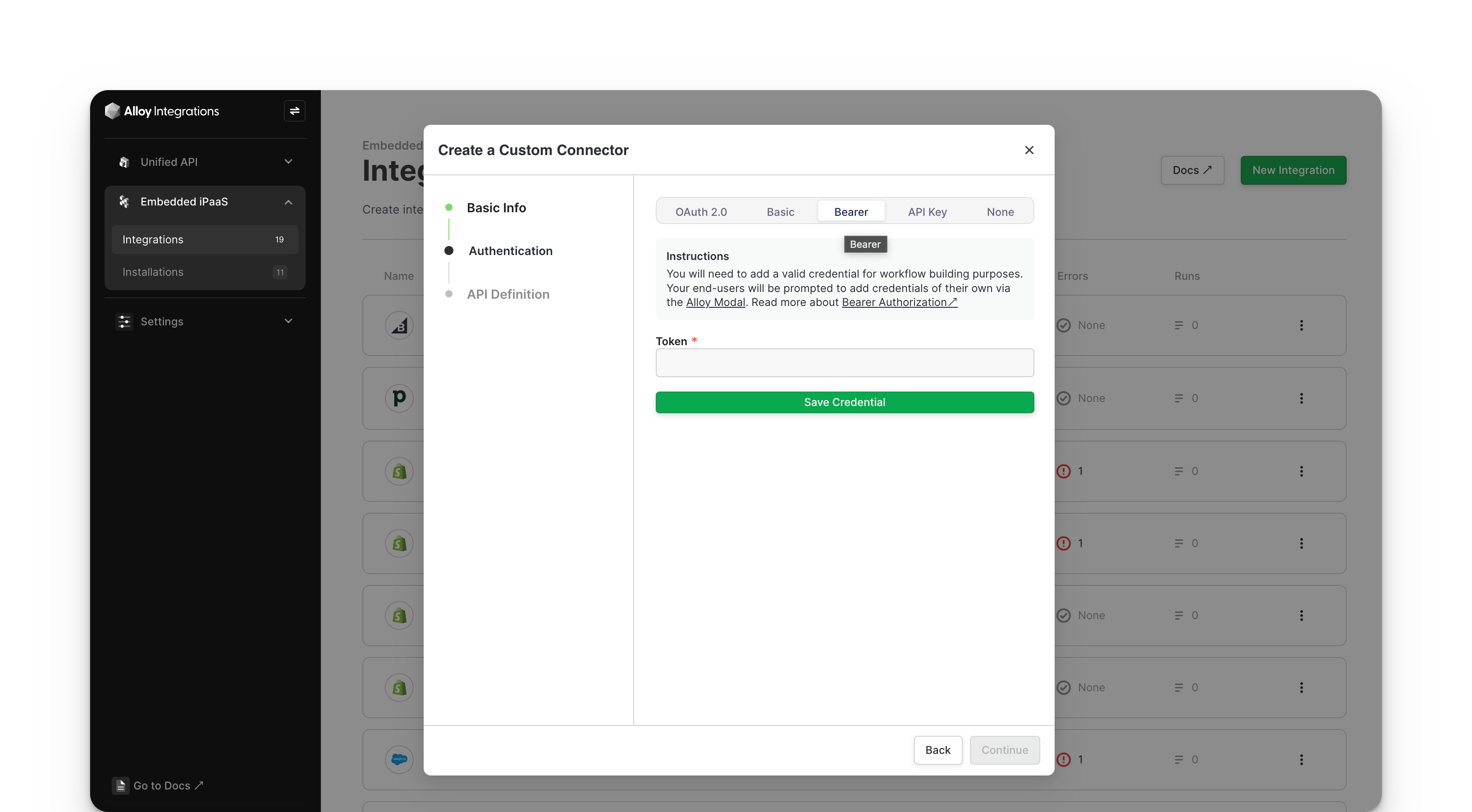 Navigate to the Authentication step. Switch to the Bearer token Authentication screen by clicking on the Bearer tab in the modal.