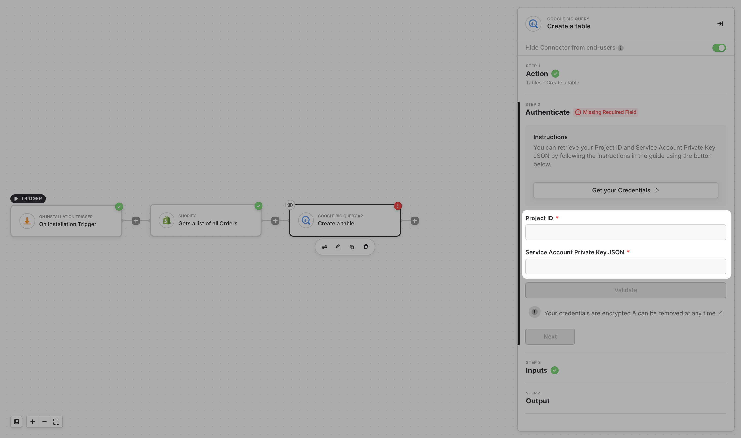 Then copy the whole contents in the JSON file created in the previous steps into the Service Account Private Key JSON field and then click on Validate.