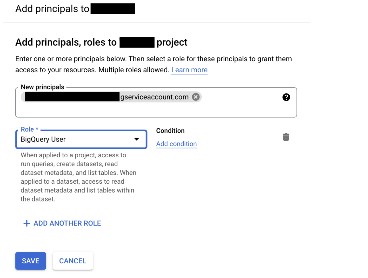 3. In the New Principals field, enter the service account. The service account is the entire email address. 4. In the Role field, search for the role BigQuery User and select that. Then click on the Save button.