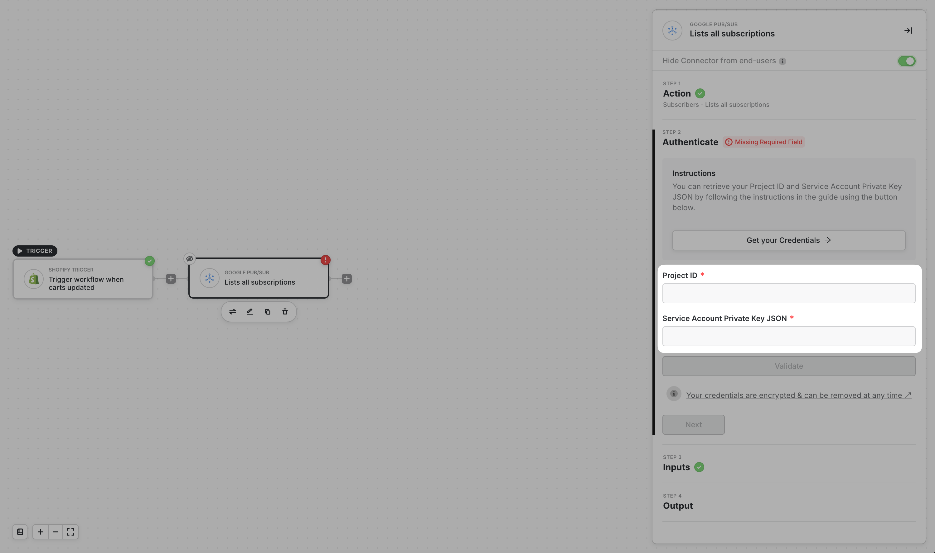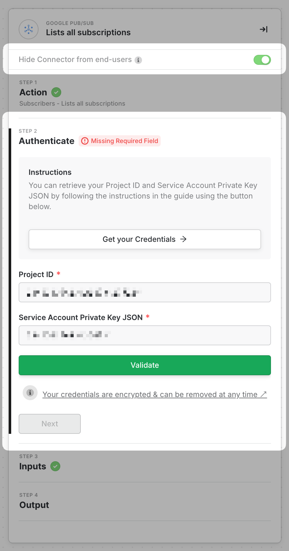 Then copy the whole contents in the JSON file created in the previous steps into the Service Account Private Key JSON field and then click on Validate.