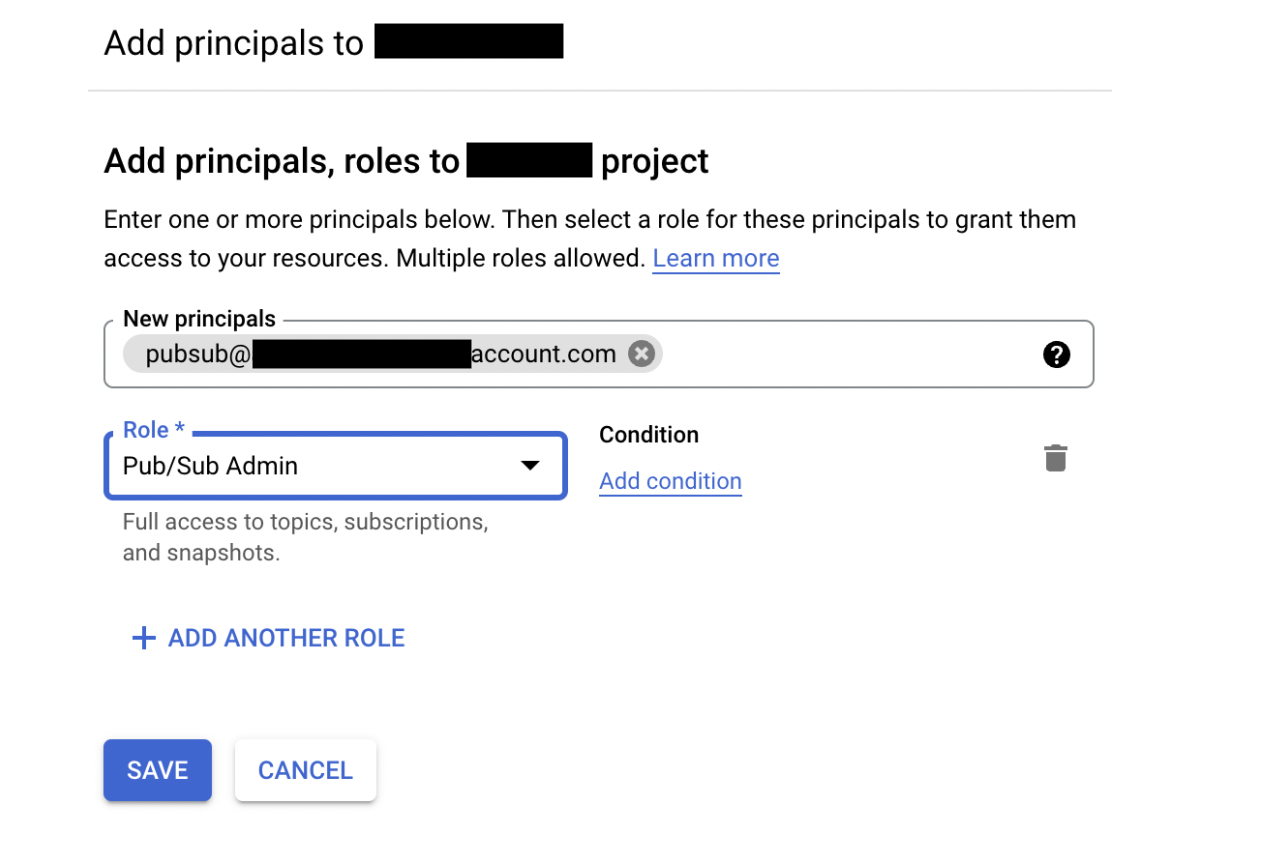 In the Role field, search for the role Pub/Sub Admin and select that.Then click on the Save button.
