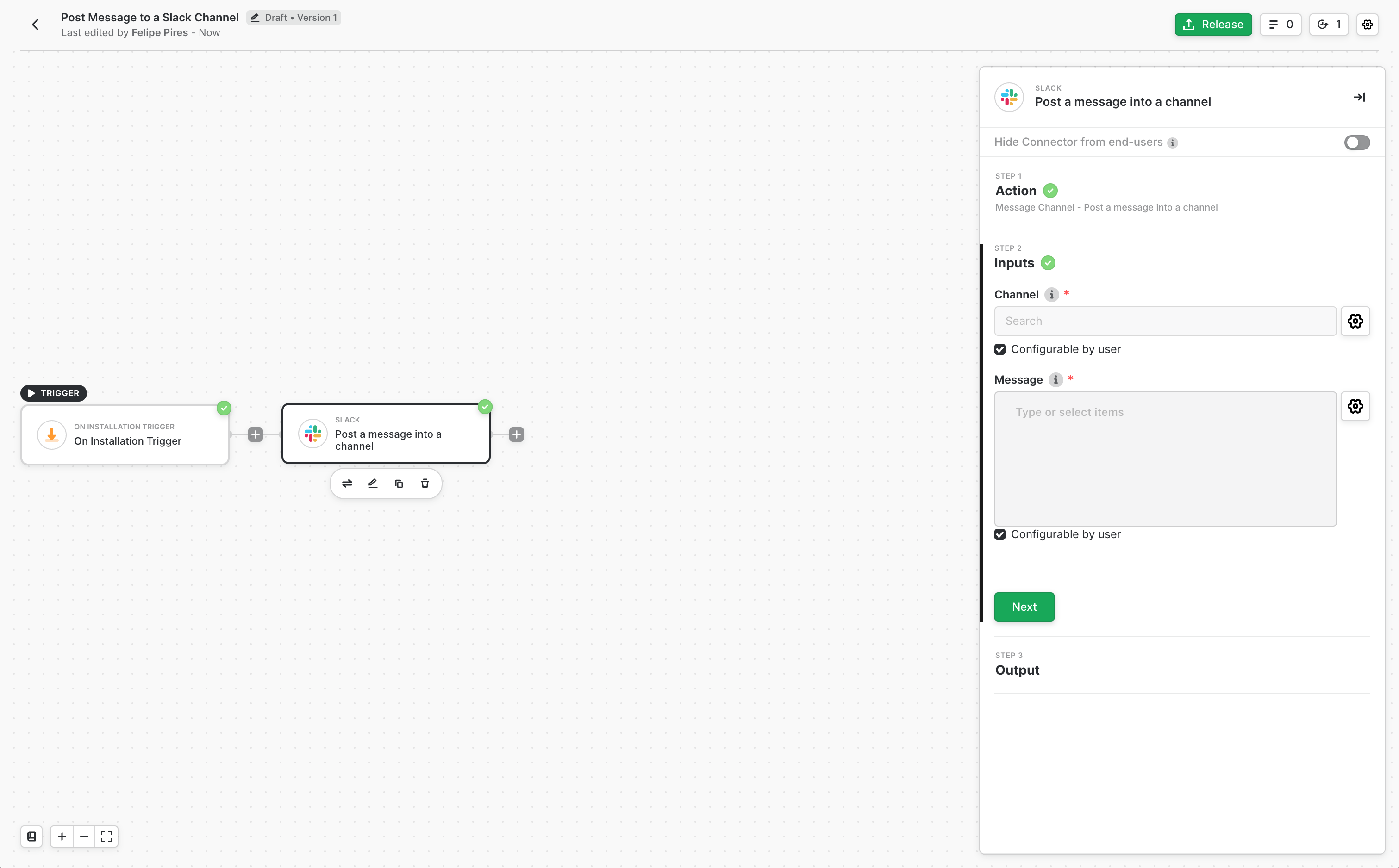 Skip to Completing the installation if your integration doesn’t require user-defined data mappings. Some integrations may require end users to map values to the third-party app, as explained in this article. For example, if your integration sends messages to a Slack channel, end users need to specify the channel and message content. You can mark these fields as Configurable by user in the workflow builder: