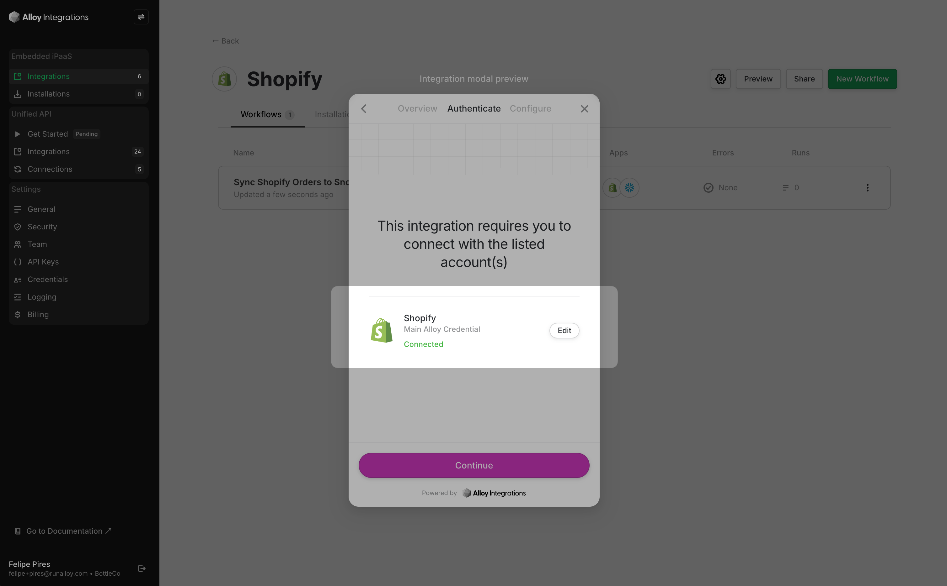 Most workflows have two sides: one that requires user authentication and another that sends data to your application or data warehouse. While users need to connect their accounts for the former, the latter sends data to your system and doesn’t require any user configuration. Let’s look at an example: In the Integration Structure article, we discussed streaming data from events to destinations. A common destination is a data warehouse like Snowflake. Suppose you need to stream data from your users’ Shopify stores directly to your Snowflake warehouse.
