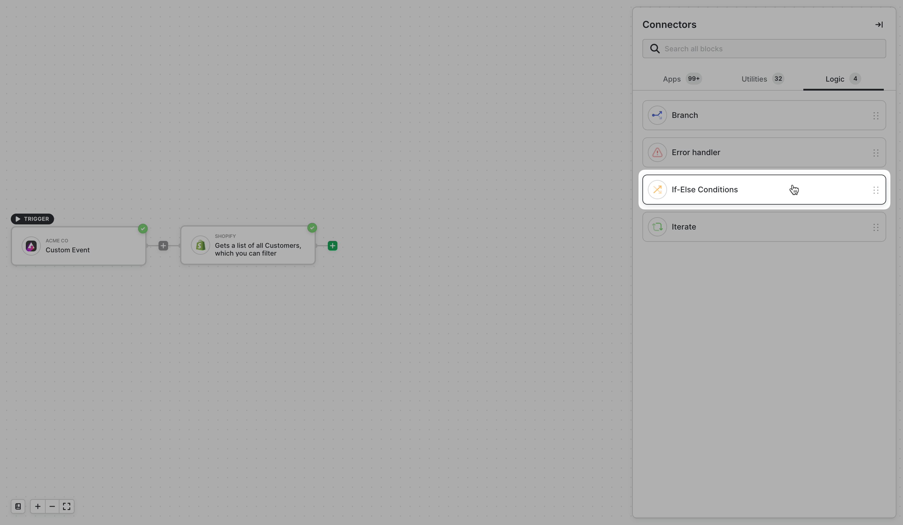 If-Else is ideal for workflows that need simple decision logic—such as verifying input data, checking user permissions, or routing records based on status. For more complex conditions with multiple outcomes, use the Branch connector.