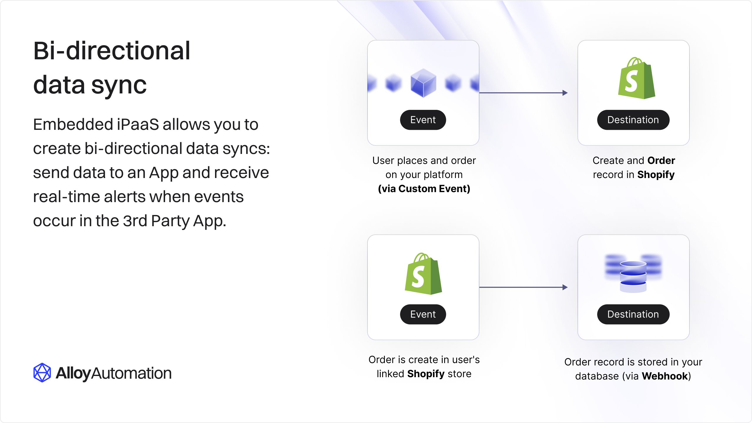 An integration is a combination of workflows centered around a Third Party App. For example, you could build a Shopify integration that has two workflows:- Workflow #1 is triggered whenever an end user places an order in your platform and then creates an order record in Shopify.