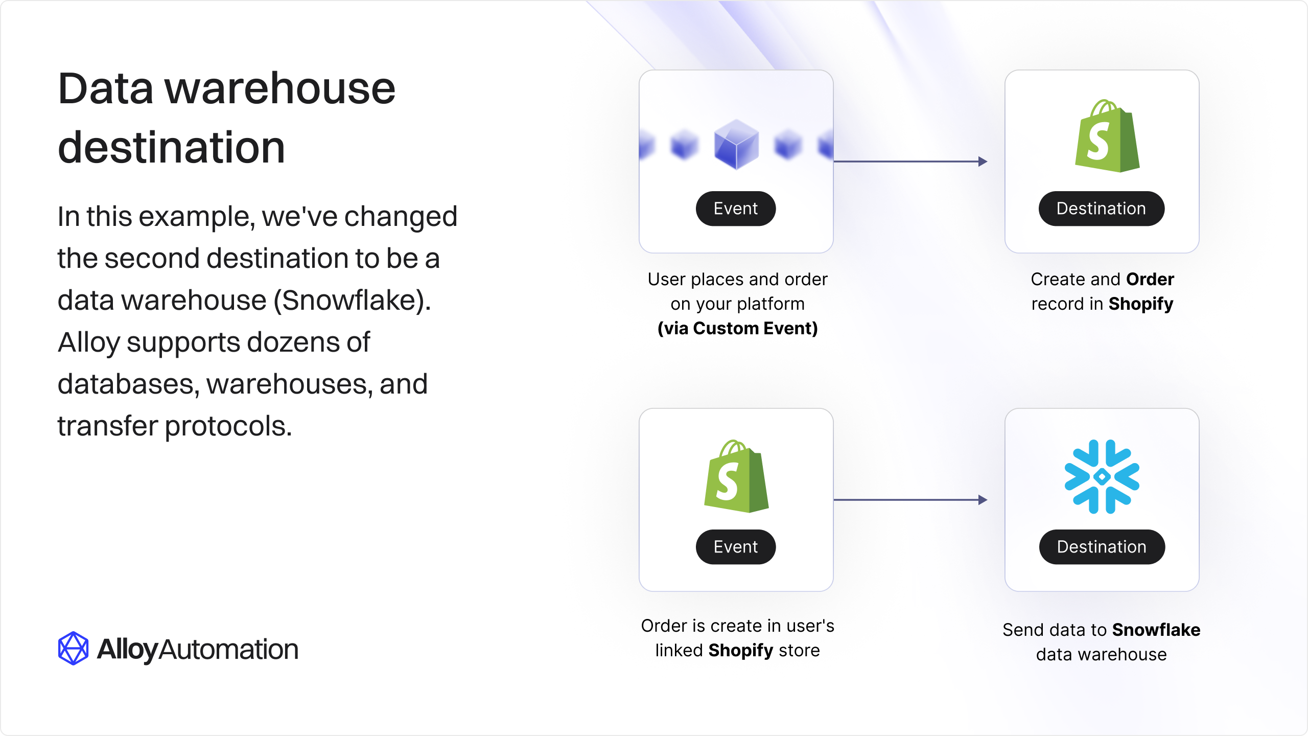 - Workflow #2 listens for new order creations in Shopify and streams them to your data warehouse