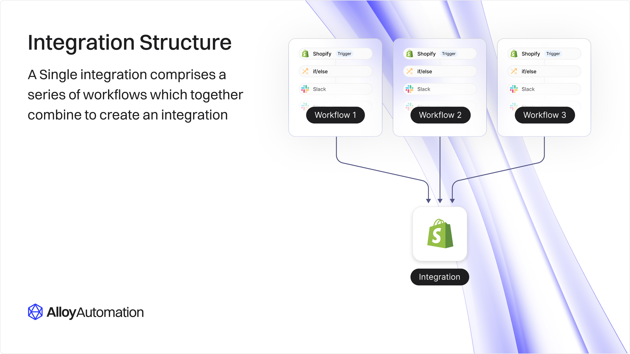 In this article, we’ll explore how to create our first integration in Alloy Embedded. For our example, we’ll build a Shopify Integration, but you can swap out Shopify for another supported app. Recall from the terminology section that integrations are made up of individual workflows centered around a single app (i.e. Shopify). When combined, a series of workflows constitutes an integration. The graphic below illustrates this relationship.