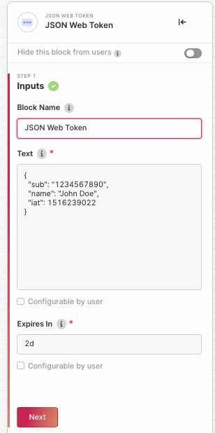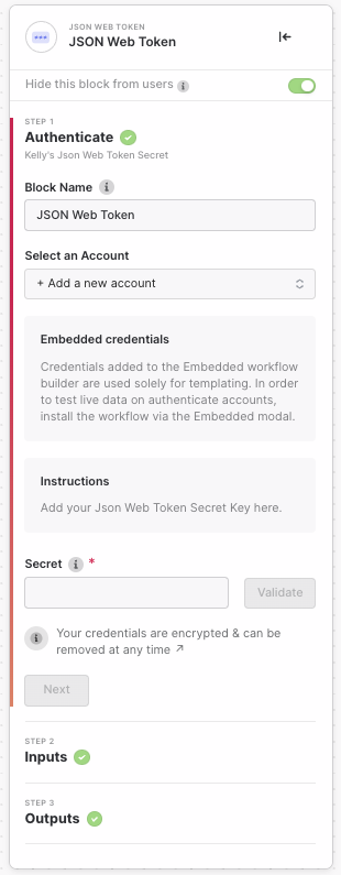 The block requires a saved credential under Settings > Credentials. You can also create one in the editor when “Hide This Block From Users” is enabled. When “Hide This Block From Users” is disabled, which is the default setting, the block automatically retrieves the secret key from the saved credentials.