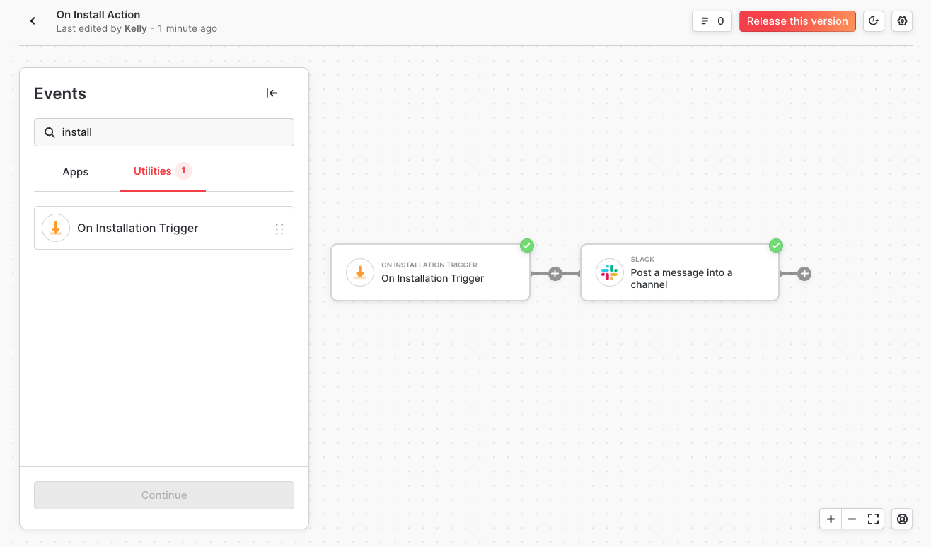 Select the On Installation Trigger and click Next. No additional configuration is required for On Installation Triggers. Simply add the desired logic and release the workflow. Now, whenever the Integration is installed either as a whole or with this workflowId