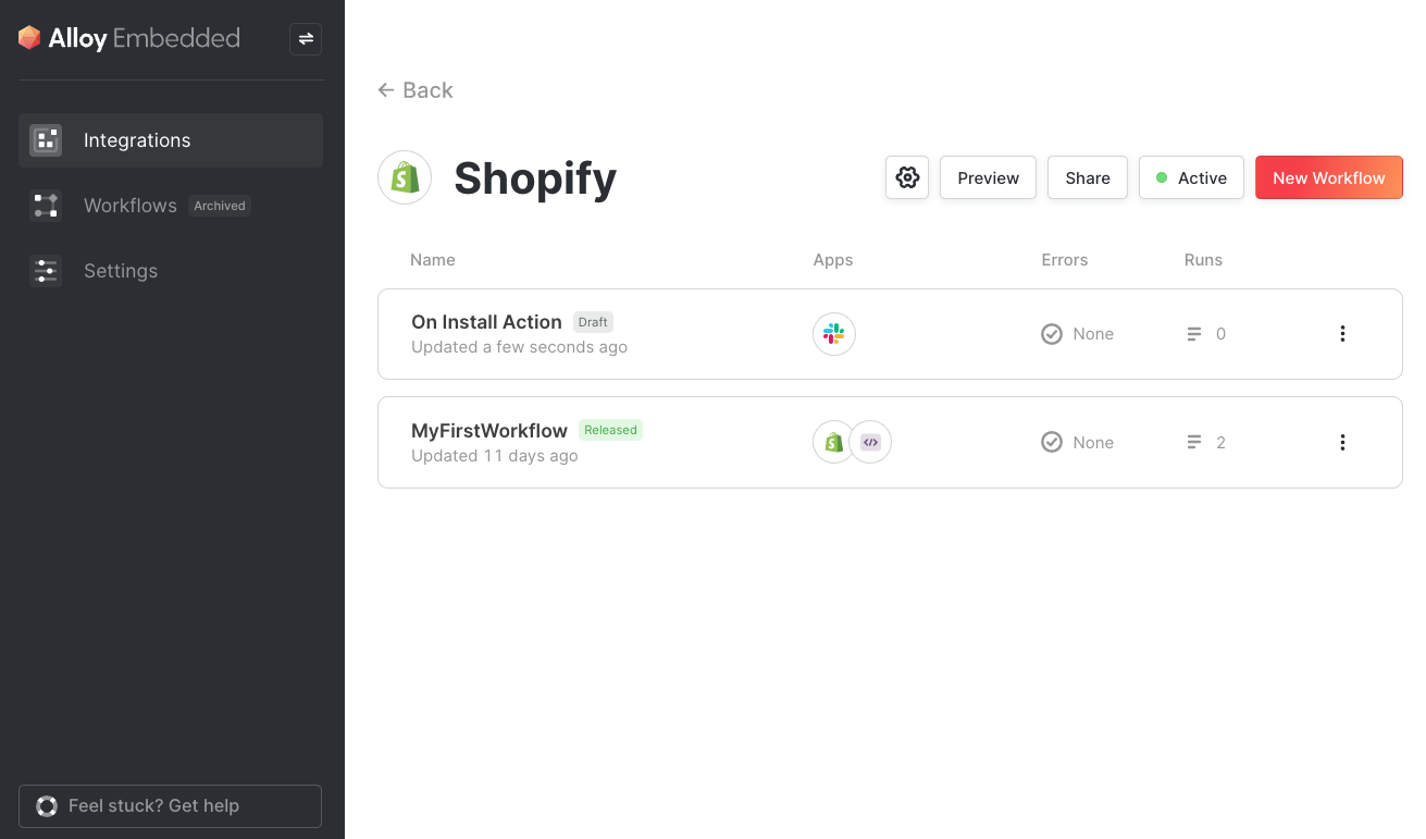 Consider this Shopify integration as an example. We have two workflows: one containing our Shopify workflow and another with the On Installation workflow.
