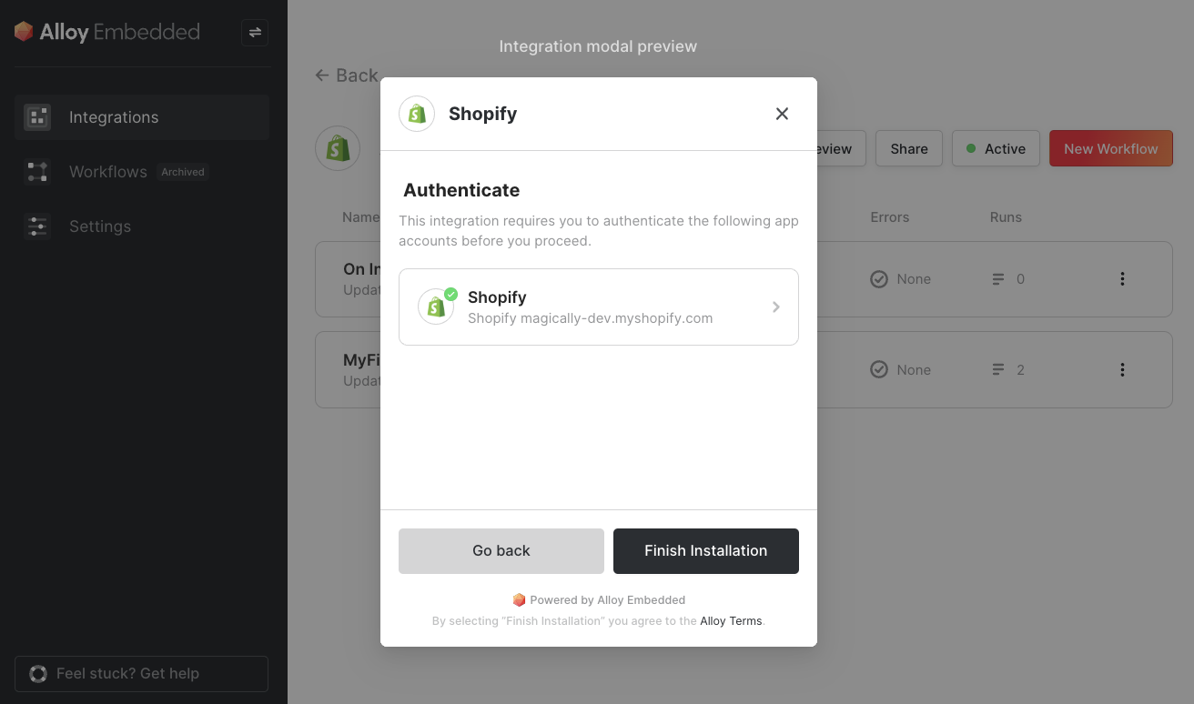 On Installation workflows are automatically hidden from your users, so they won’t see them when installing your integration using the Alloy Frontend SDK modal.