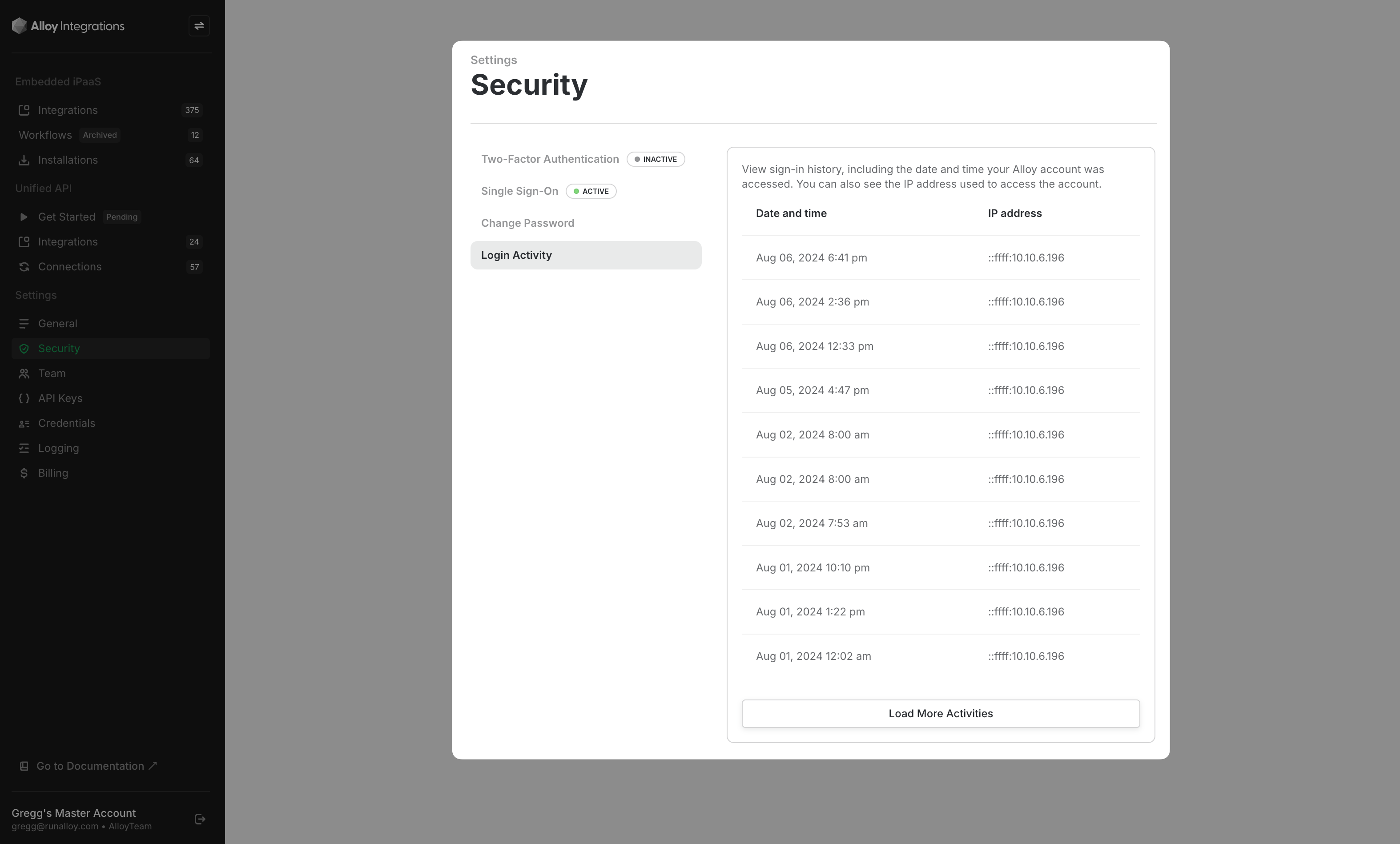 To keep in line with industry best practices, we store access logs for every time a user logs into Alloy. Our access logs track the date a login occurred and the corresponding IP Address.