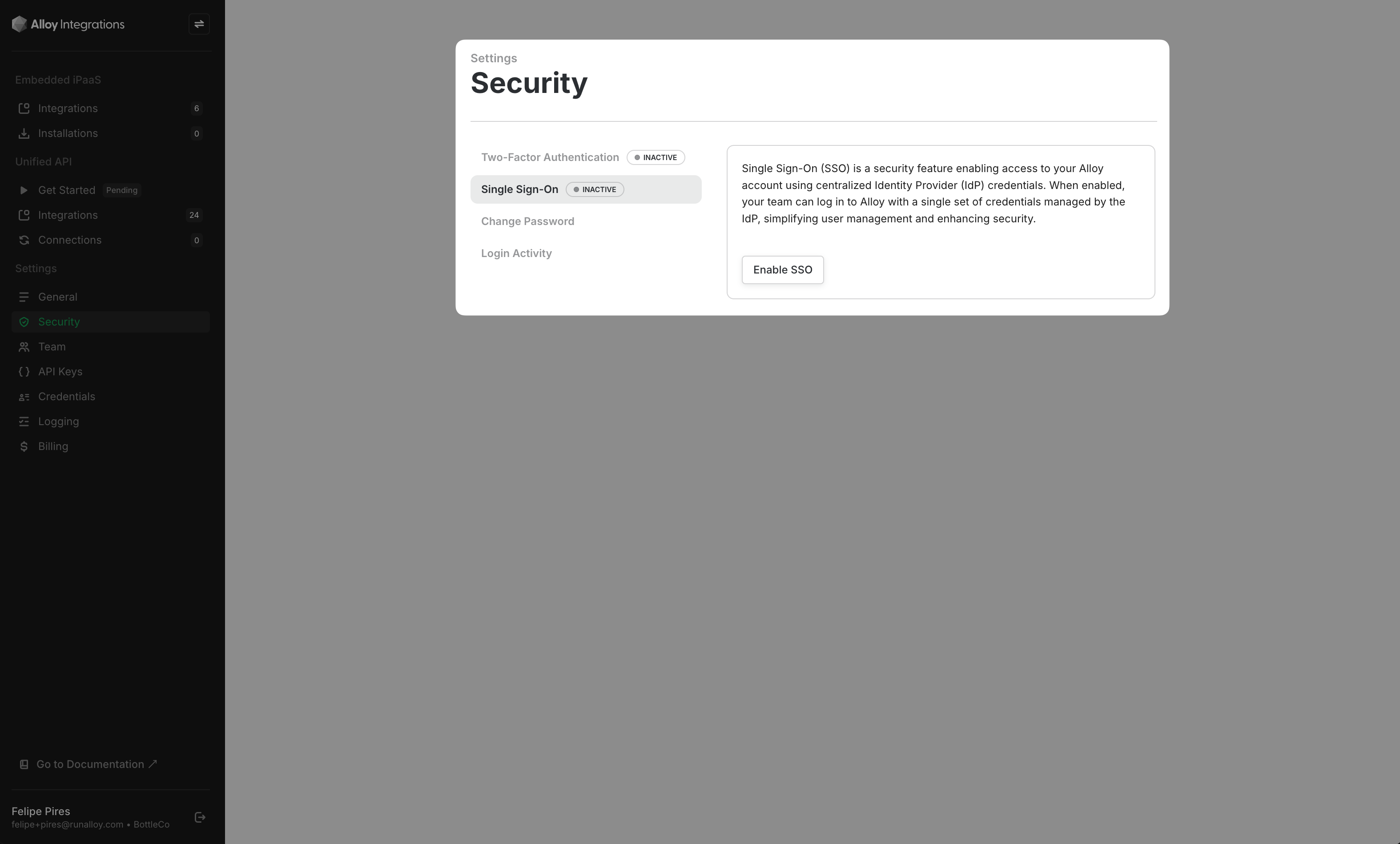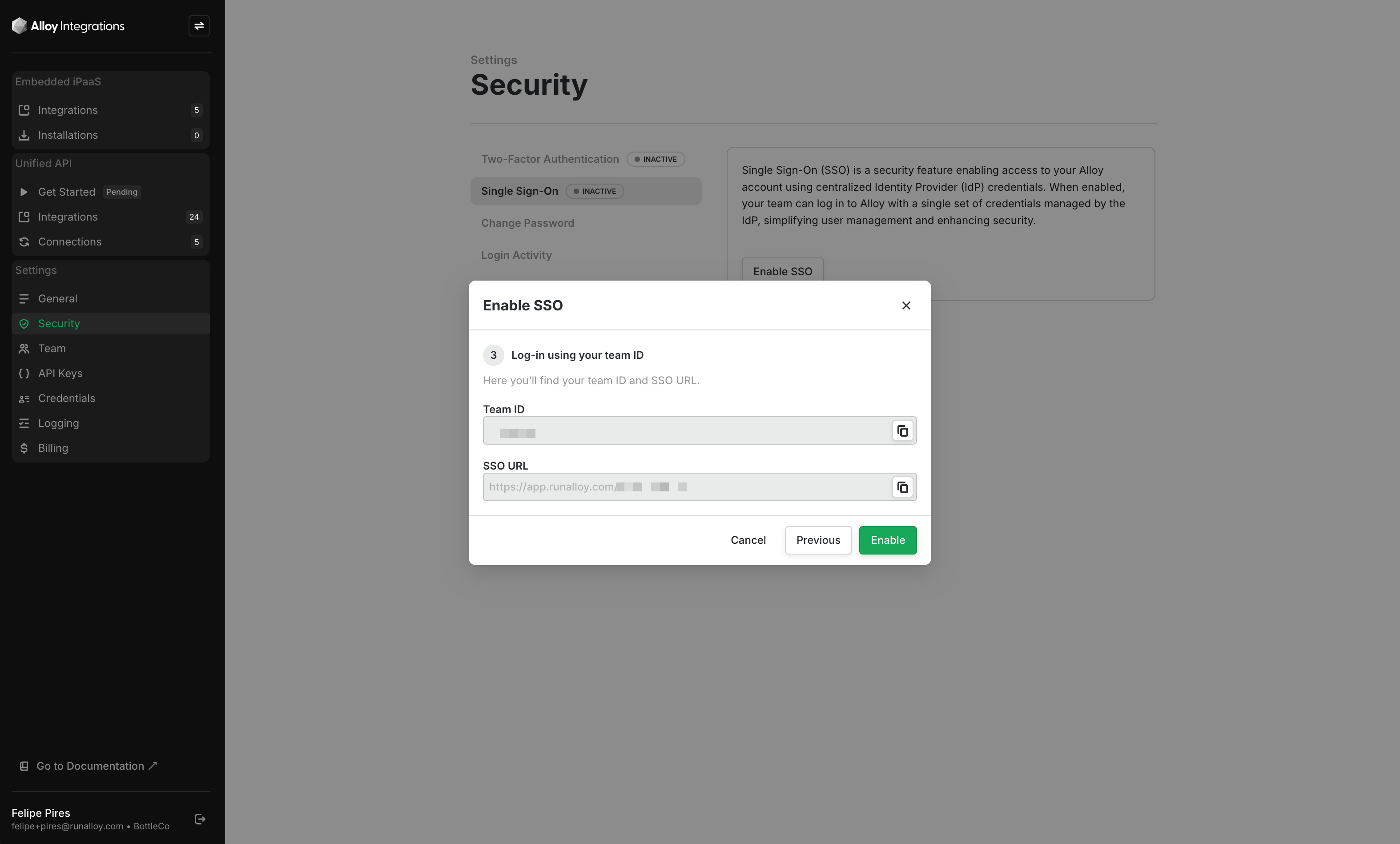 In a separate browser tab, access Alloy. After logging in, head over to Settings > Teams. From the left panel, select Security and then Enable SSO.