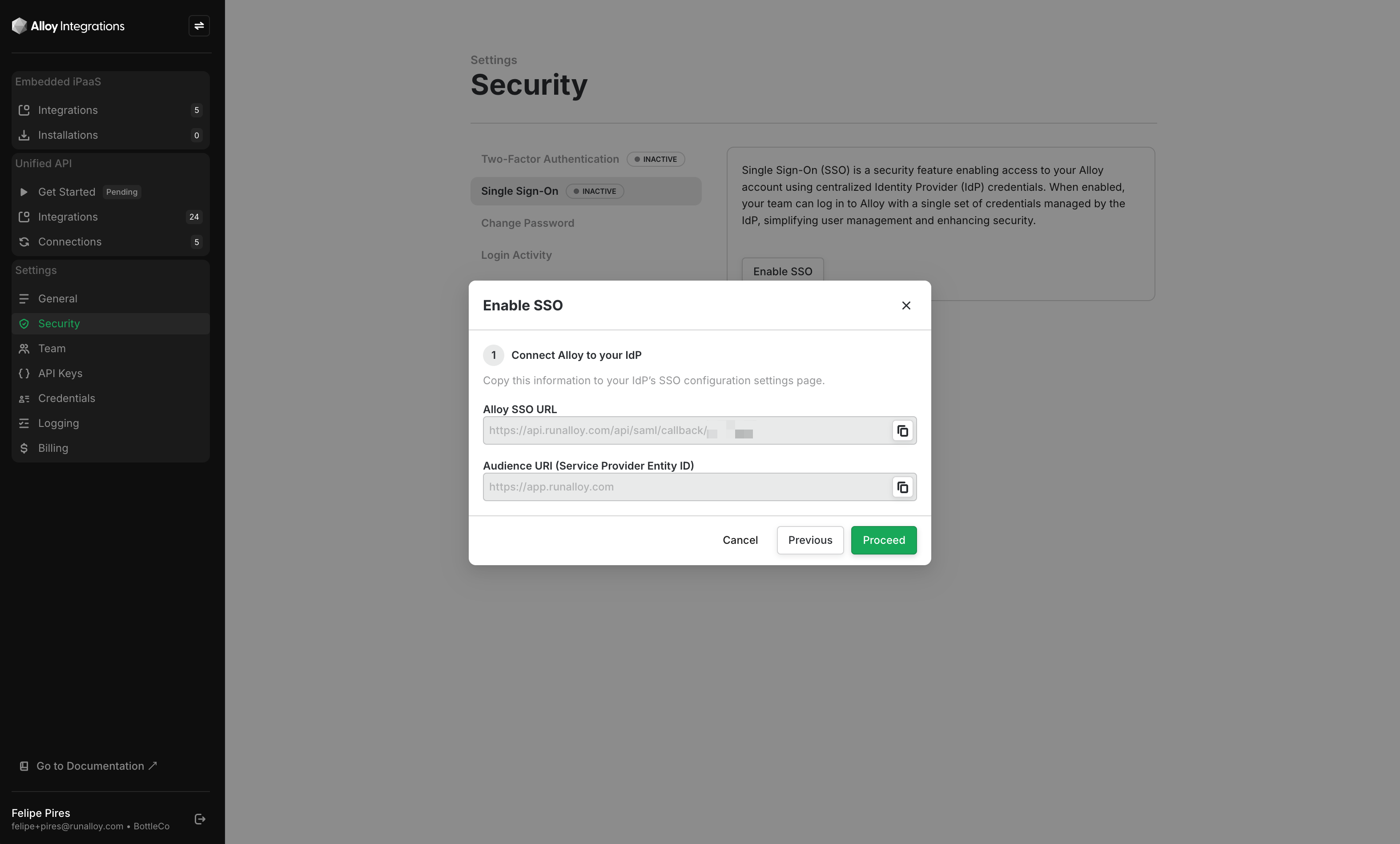 You’ll be prompted for your Alloy account password. After providing it, copy the “Alloy SSO URL”.