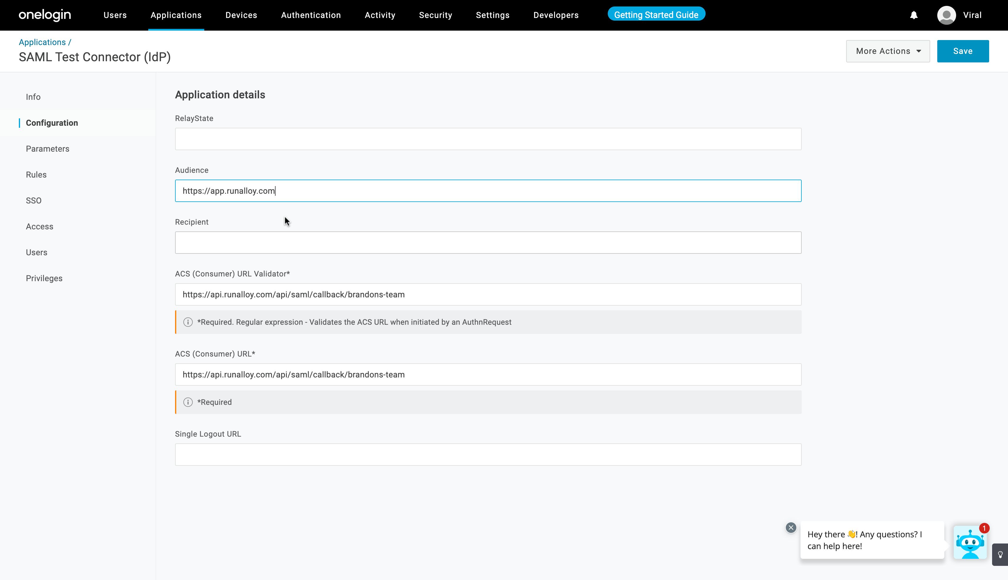 - Switch back to ONE LOGIN and select Configuration from the left panel. Here, paste the “Alloy SSO URL” into both the “ACS (Consumer) URL Validator” and “ACS (Consumer) URL*” fields. The “Audience” should be set to https://app.runalloy.com.