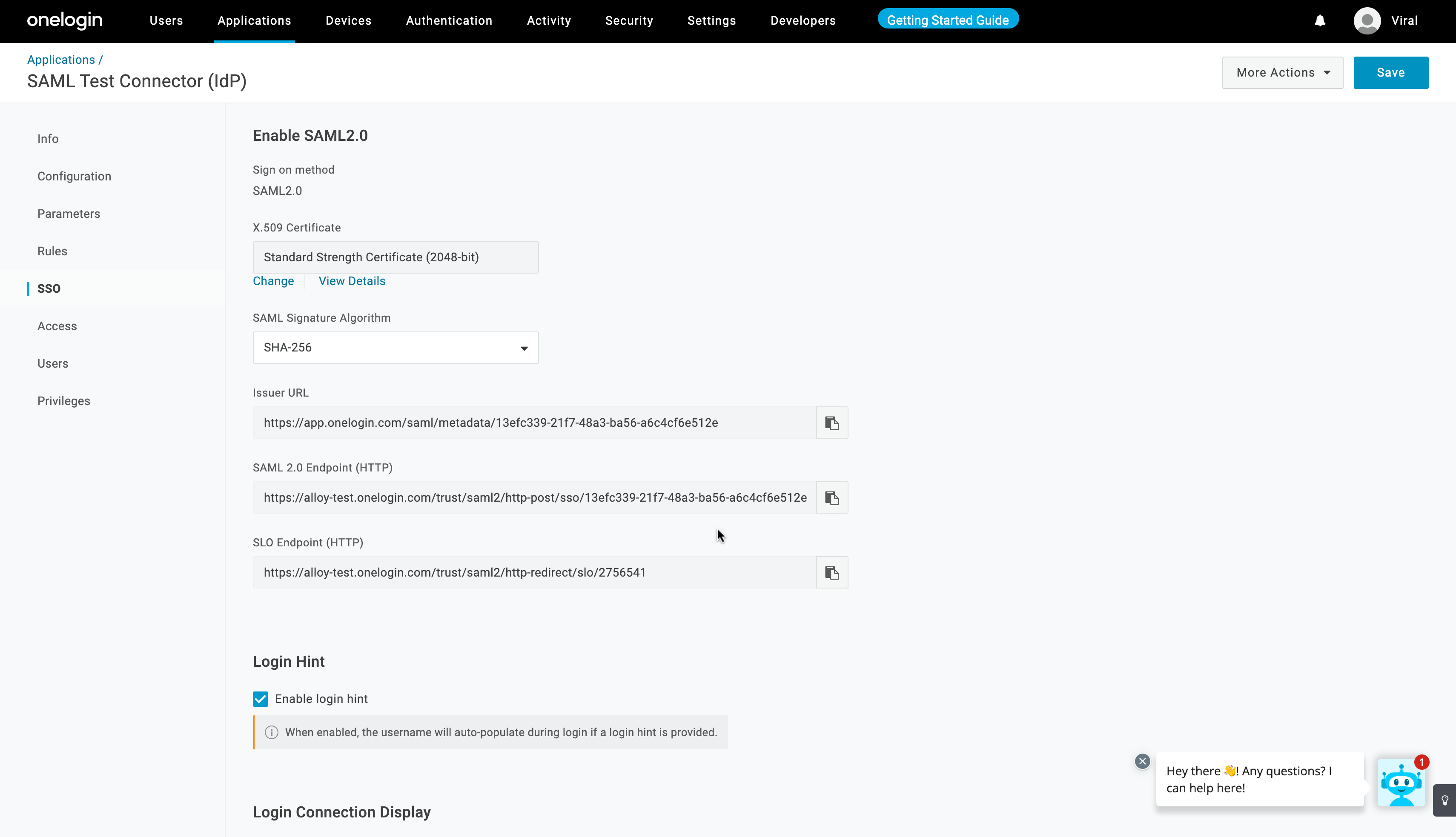 - Next, in the SSO section of ONE LOGIN, copy the issuer URL and paste it in the Alloy modal under “IdP Issuer”. Then copy the “SAML 2.0 Endpoint” and paste it in the Alloy modal under “IdP SSO”, ensuring the “SAML Signature Algorithm” is set to SHA-256.