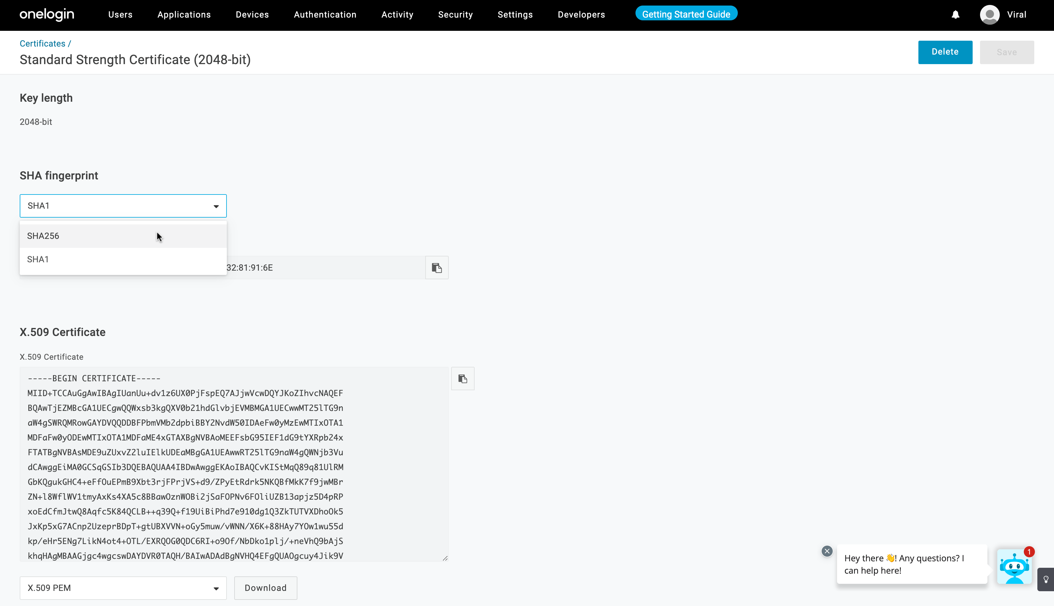 - Under “X.509 Certificate”, adjust the SHA fingerprint to SHA256 and copy the value in the X.509 Certificate.