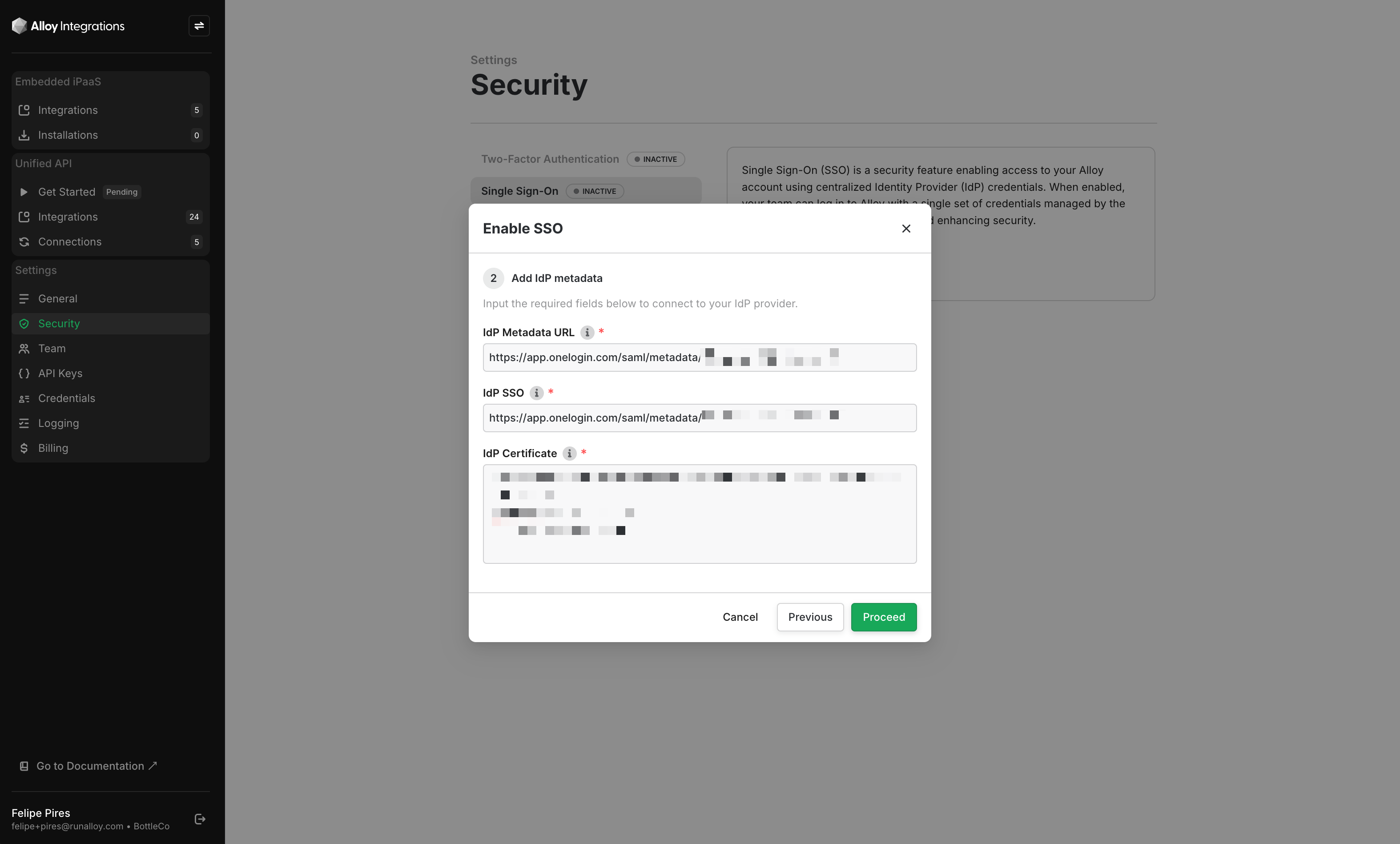 - This value should be pasted into Alloy’s “IdP Certificate” field. Once all details are filled in, click Proceed on Alloy.