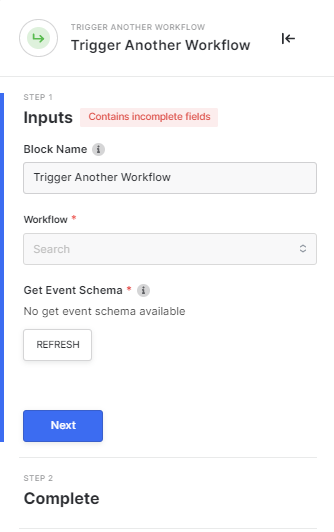 Now this workflow will be built as usual with the Trigger Another Workflow block added to the desired spot in the workflow. To trigger the second workflow from this block, you will just need to select the Custom Event from the Workflow dropdown and then the Event Schema will become present. Just finish mapping the proper variables to the schema fields and you’re off to the races!