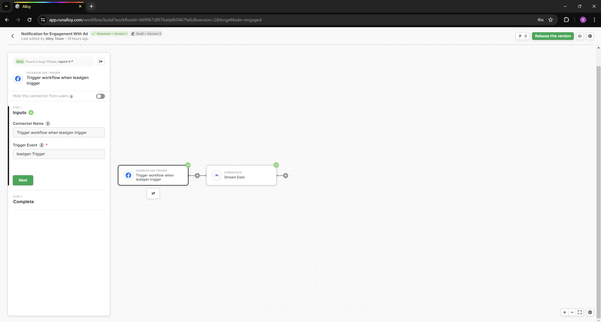 Imagine you have marketing campaigns running on various platforms, and you want to capture lead data whenever a customer interacts with your ads. This includes actions such as clicking on an ad, filling out a form, or initiating a chat. By receiving real-time notifications and automatically collecting lead data, you can promptly follow up with potential customers and nurture them through the sales funnel. To achieve this, we’ll create a workflow that integrates with advertising platforms to monitor ad engagements and capture lead information. We’ll focus on Facebook Ads for this example, but the principles can be applied to other platforms supported by Alloy. Let’s get started with the setup!Setting Up Lead Data Notifications