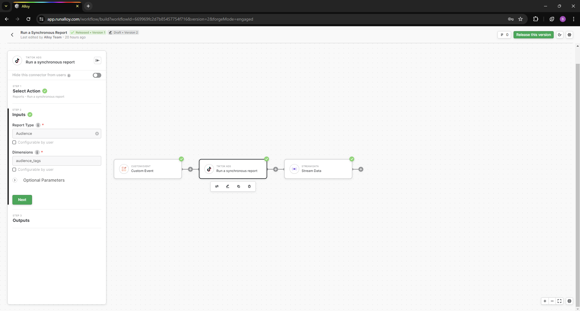 For this workflow, we’ll choose a Custom Event Trigger as our starting point. This will allow Alloy to map the data and take action in our commerce system. Next we will add the TikTok Ads connector and select the “Run a synchronous report” action. Here we can define the report type and the dimensions to be included. Lastly, add a Stream Data connector. This connector will tell Alloy where to send all the report to. Specify a destination URL of your choosing. You can see an example of this workflow below.