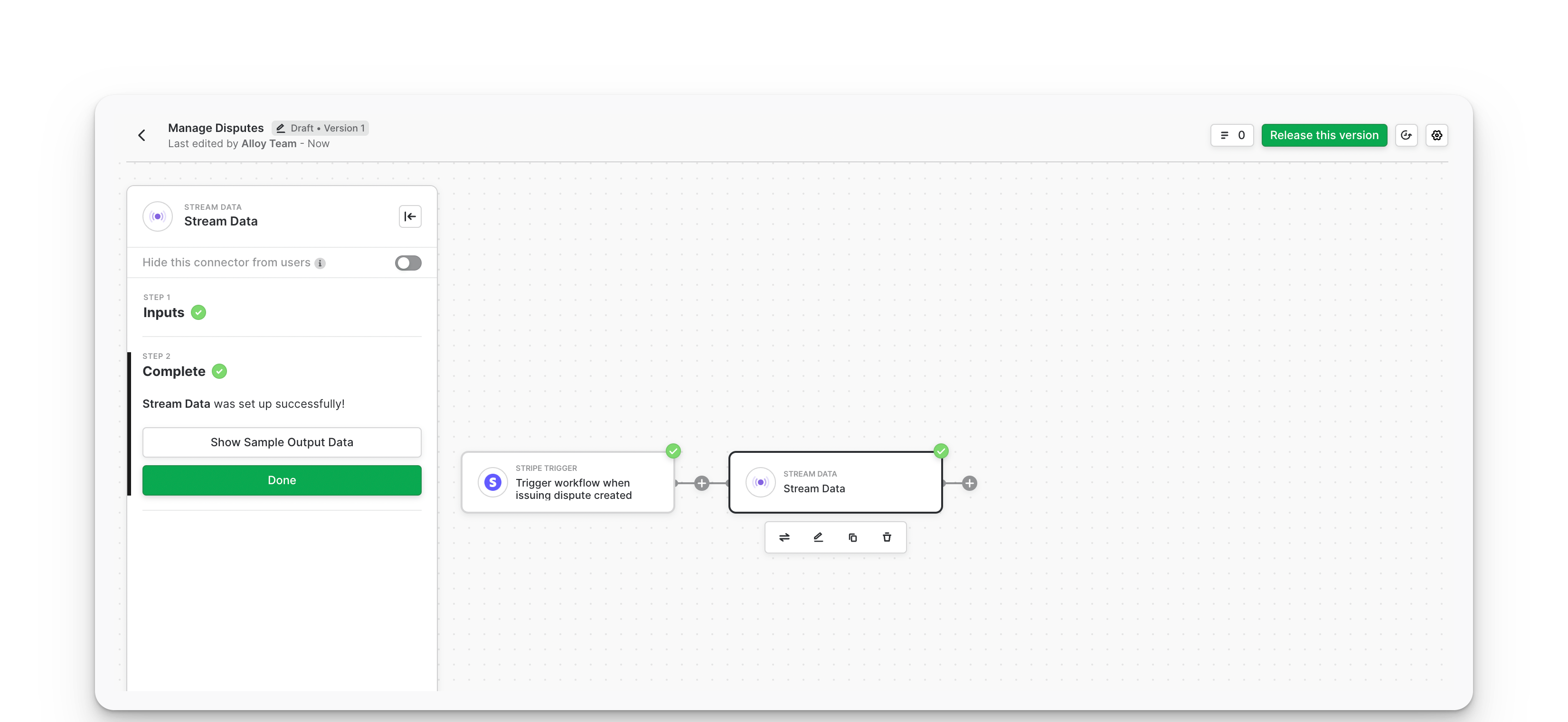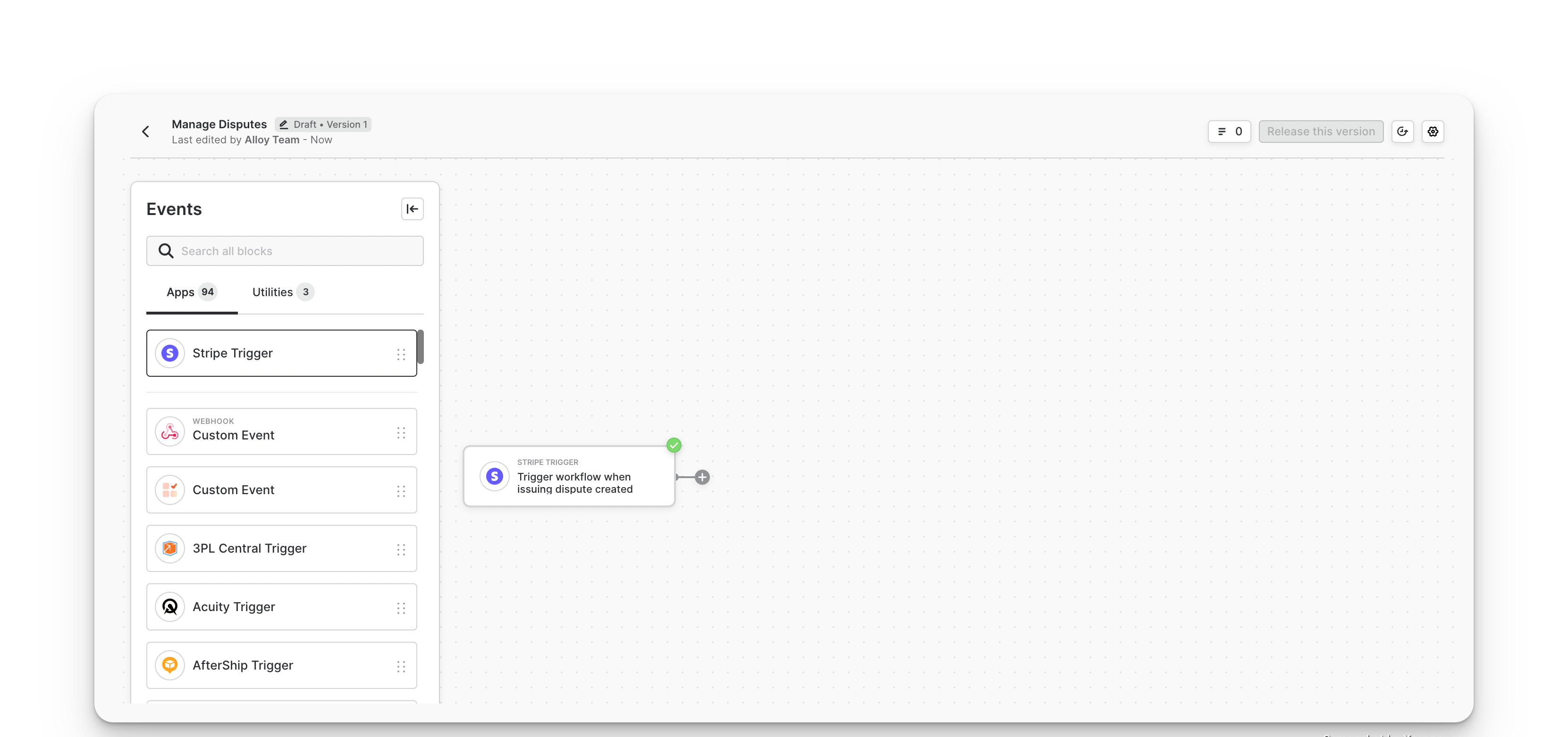 Alloy’s payments connector allows you to build dispute management features into your app using a simple workflow editor.