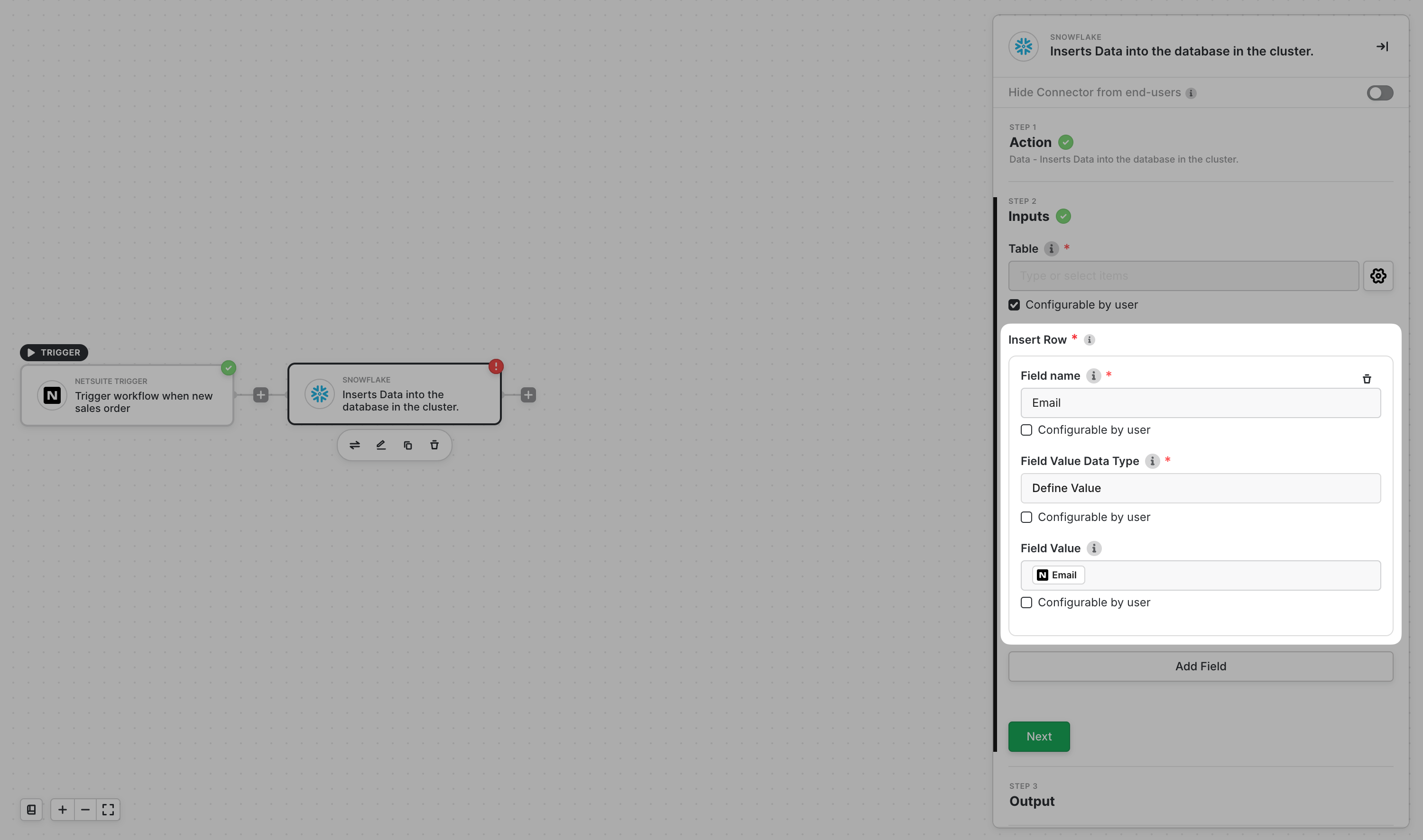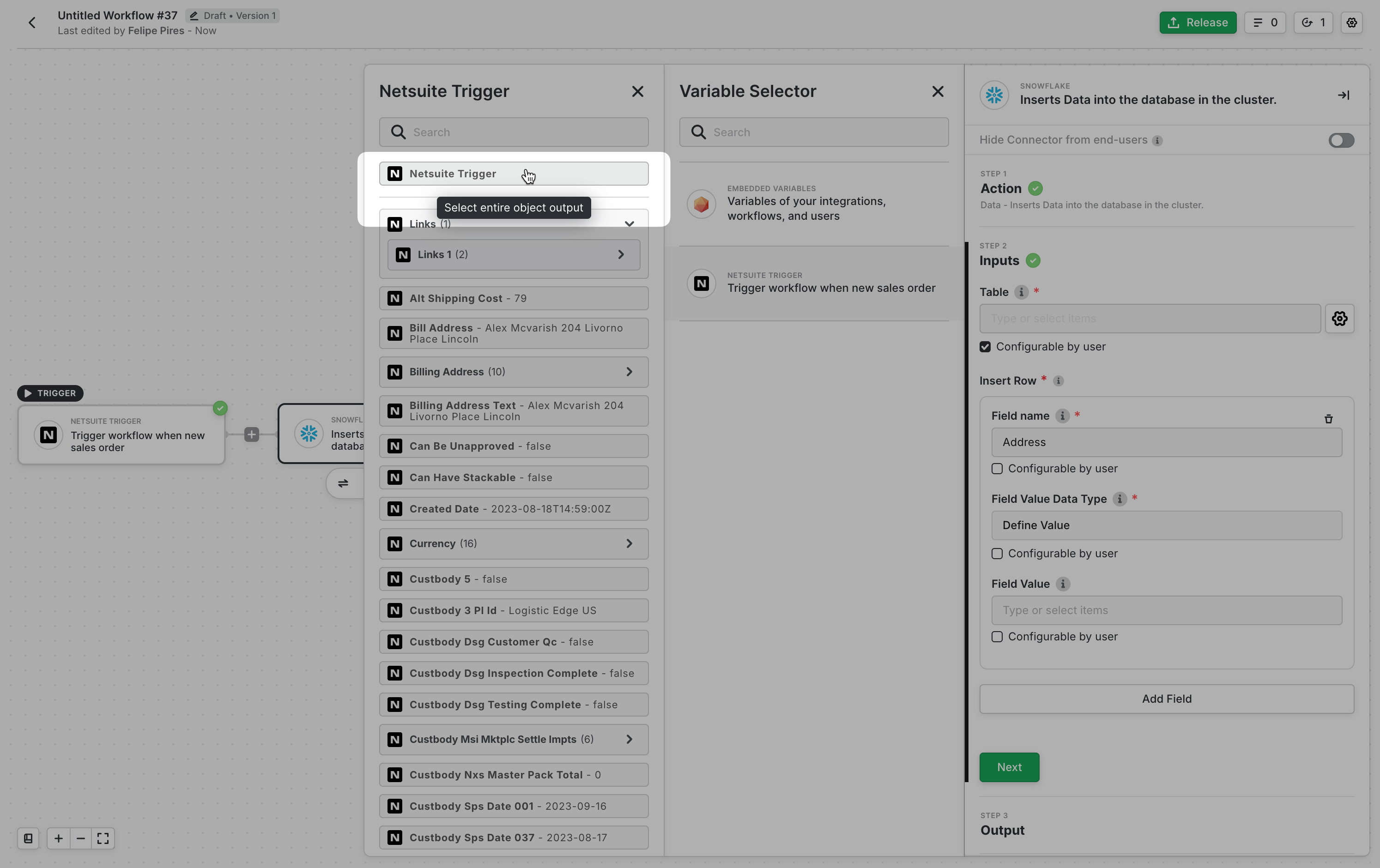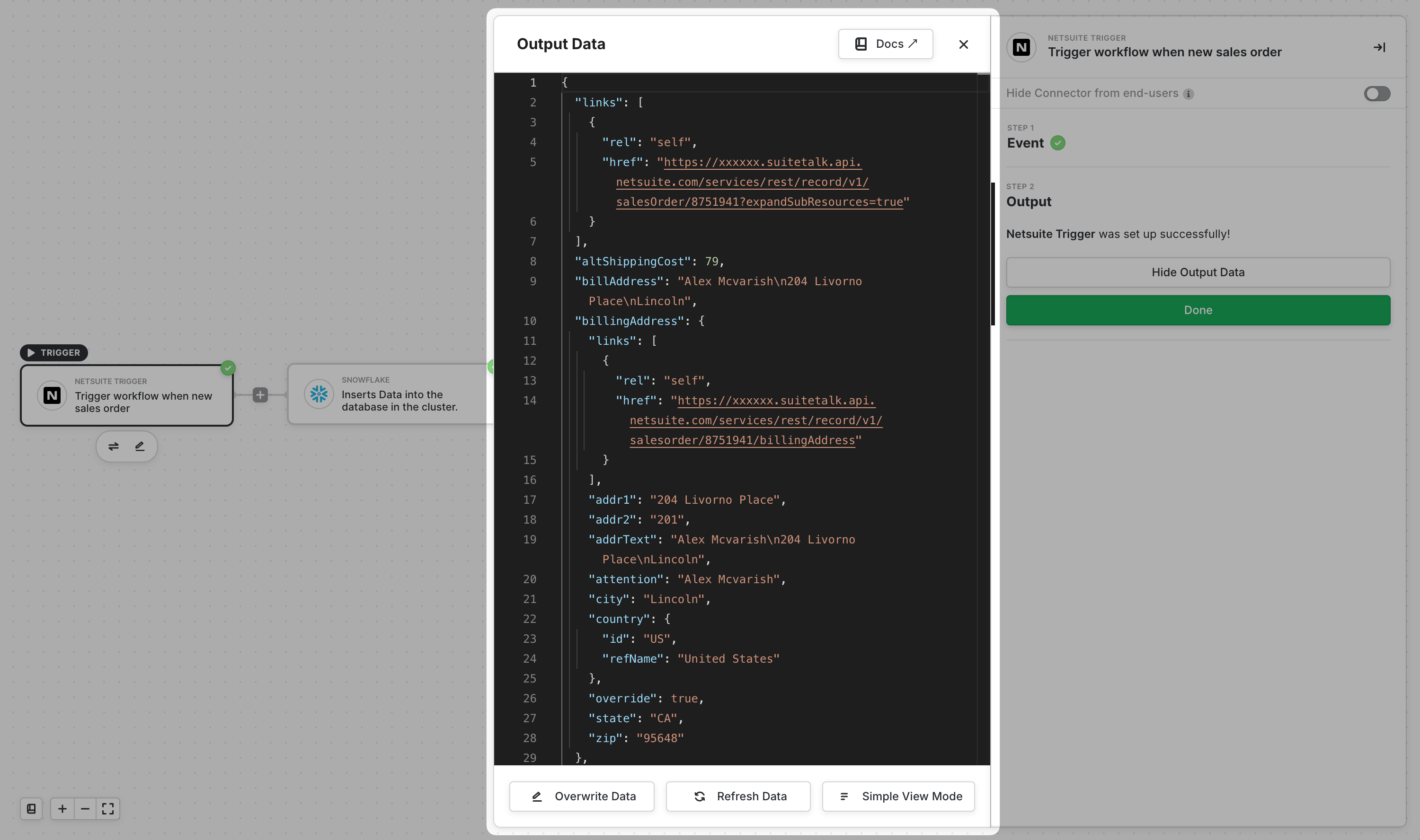 However, sometimes workflows need to get a bit more granular. We’ve build a workflow that triggers each time a new order is created in NetSuite. Let’s assume you want to send over only the billingAddress sub-object to Snowflake.