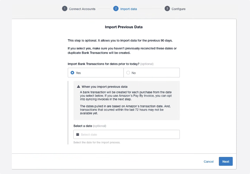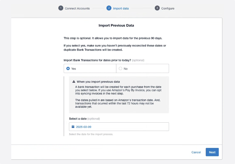 You can import up to the past 90 days of Amazon Business data.